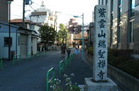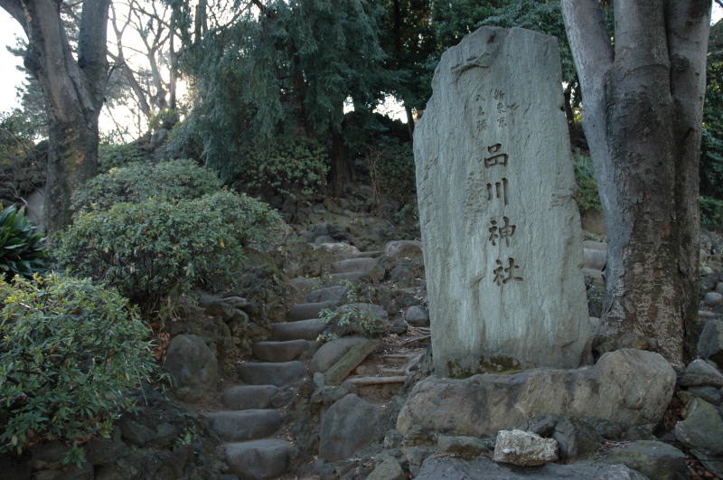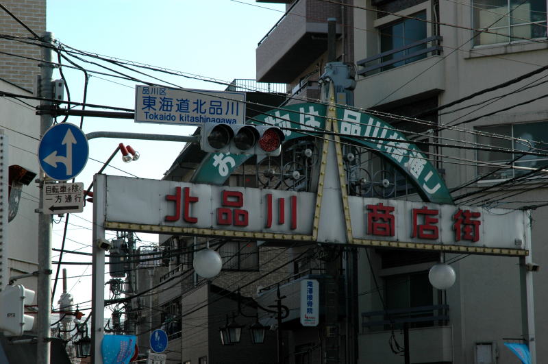 | JR品川駅から第一京浜国道(国道15号線)に沿って南下すると、右手に品川神社が現れる。最寄り駅は京浜急行新馬場駅となるので、歩く距離を節約したい場合は、新馬場から歩き始めることをお奨めする。 品川神社前の横断歩道を渡り、京浜急行の高架下を抜けて商店街を歩いてゆくと次の目的地への看板が立っている。 |