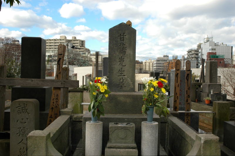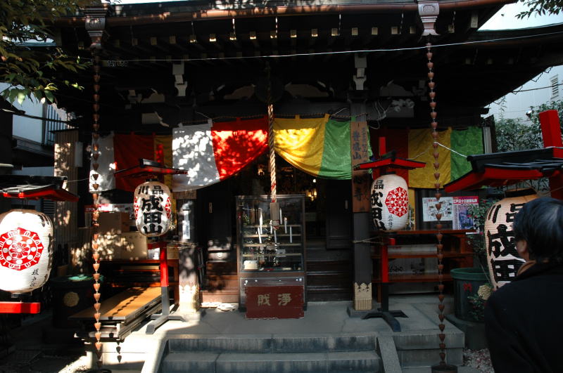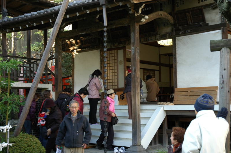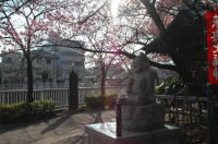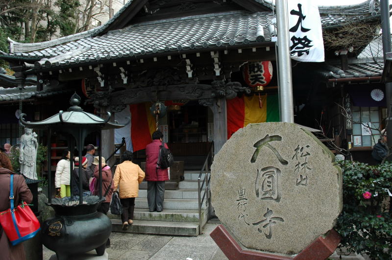 | 目黒不動参道にある、タコ薬師に寄り道。入り口付近に寄せ植えがあり、前に来たときには福寿草があったので新年早々おめでたい花を見ようとよったのだが、今回は見ることができず残念!その先の安養院では蝋梅が咲き始めて、よい香りであった。 目黒不動にお参りをして、そのまま裏へ抜ける。甘藷先生(青木昆陽)の墓の前を通り過ぎて、山手通りへ戻る。通りを渡り、目黒川に架かる太鼓橋を渡り、行人坂を登ってゆくと次の目的地である。 |