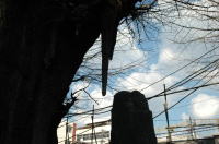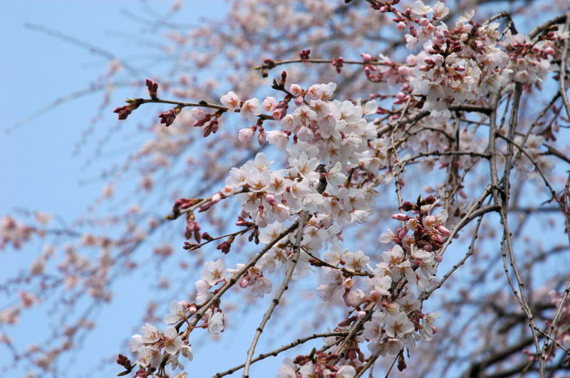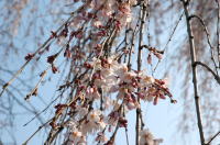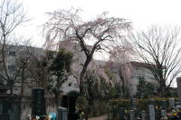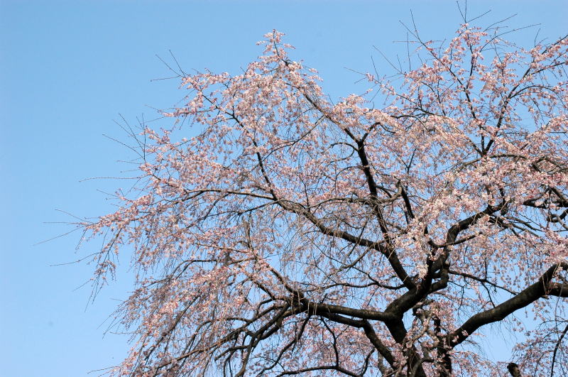| このシダレザクラはお姉さまご自慢の桜で、W先生も桜の季節は初めてとの事。見事な古木である。 桜の花を撮るのは難しい。どうしても青みがかってくすんでしまうのだ。今回もそんな感じであったので、フォトレタッチソフトで赤みを強く補正して、明るくした。実際シダレザクラはソメイヨシノより赤みが強いのでこの写真のイメージどおりと思っていただいてよい。 |