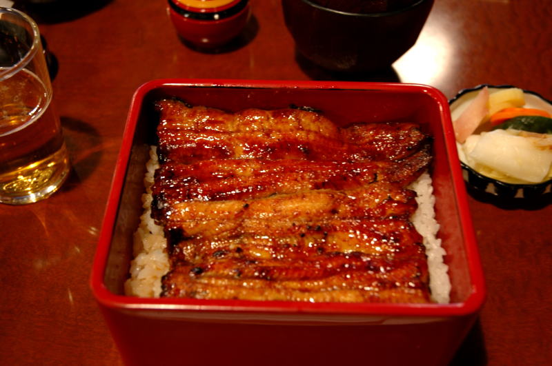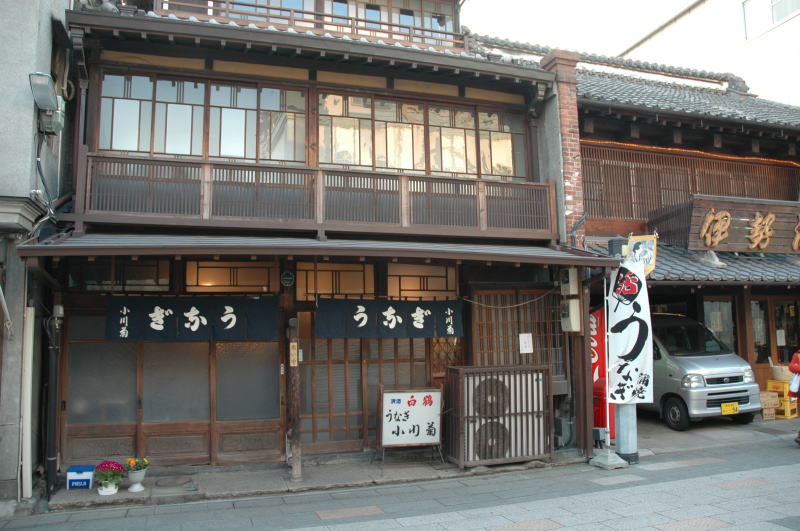 | 4時過ぎに早めの夕食で小川菊といううなぎやさんへ。小川菊は蔵の街並みの通りから一本入った大正浪漫通りに面している。メニューはうな重(1800円)とうな重上(2100円)の二種類のみ。後から来たお客さんが「肝焼きとか、つまみはありませんか?」と聞いていたが、「つまみはおしんこ盛り合わせくらいしかないんです」と答えていた。 ビールをちびちびやりながら、約30分うなぎが焼きあがるのを待つ。ふっくらとしてボリュームのあるうなぎがとてもおいしかったです。人気店なので、時間をずらすか少し待つ覚悟で行ったほうがいいようだ。でもこのうなぎはおすすめ! |