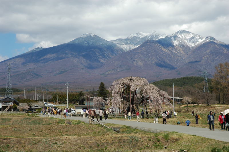 | ペンションペアハットオーナーのお出迎えを受け、宿泊用の荷物は車に預かってもらった。身軽になった我々は最高に晴れ上がった空の下を大滝湧水公園へ向けて出発。湧水公園の近くに鷺のサンクチュアリがあり公園のマス釣り用の池が、鷺の餌場になっているとのこと。まだ観光シーズンには早いのかマス池には水を張っていなかった。 湧水公園の次は三峰の丘。日本最高峰の富士山、第二位の南アルプス北岳、第三位の北アルプス奥穂高岳を一度に見ることが出来る場所だ。この日は西のほうに少し雲があって第三位だけは見ることが出来なかった。 続いては本日の花「神田(しんでん)の大イトザクラ」!満開を少し過ぎてはいたが、樹齢400年の桜は今年も立派に花を咲かせていた。 |