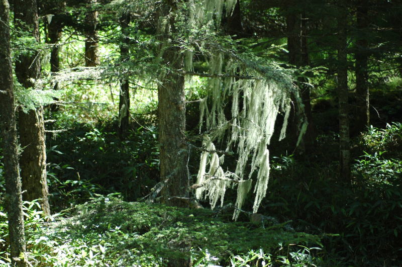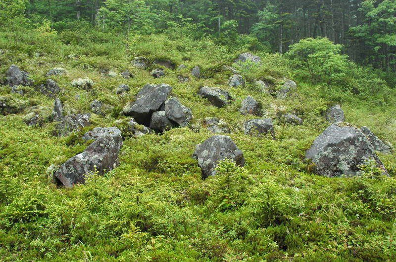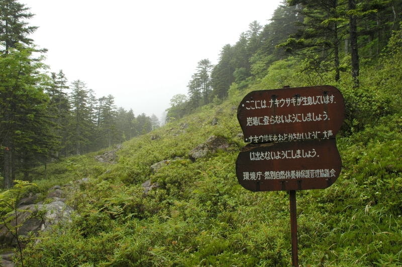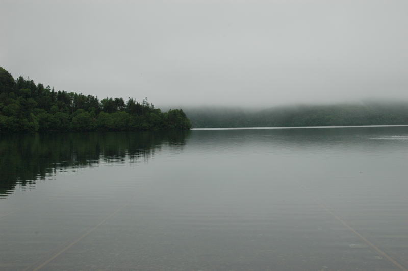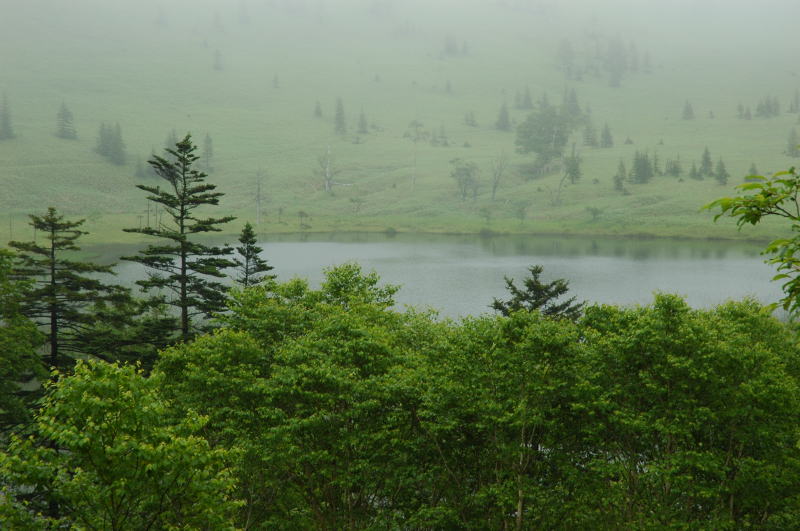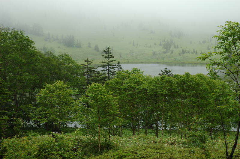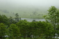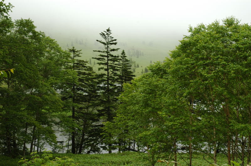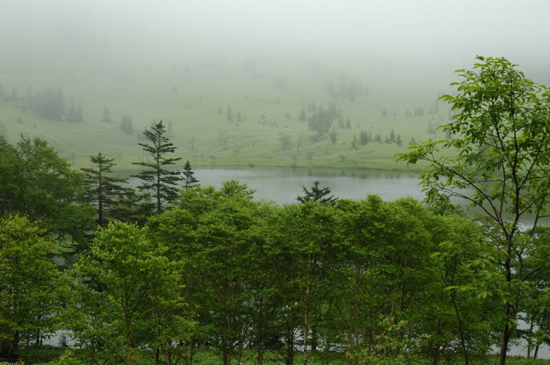 | 登山口である白雲橋に到着すると、雨は上がっていた。せっかくここまで来たのだからという思いが強く、装備を整えて歩き始めた。 東雲湖へ向かう道は然別湖沿いの登山道なので、思っていた通りアップダウンは少ない。しかし道が狭く、木の根や石が露出しており、雨でぬれて滑りやすくなってあまり快適でない。それでもシャクナゲなどを眺めながら歩いていたのだが、途中で雨が強くなってきた。「一人で行ってらっしゃい」と言われ、W先生と菊さんは途中でリタイヤした。 途中でカップルとすれ違い、あと40分くらいと聞いて目的地である東雲湖へ急いだ。然別湖から離れ、少し上り坂になってきた頃から、鳥の声とは違う「チッ!」という鳴き声が聞こえてきた。ナキウサギだ! 視界が開けてナキウサギが生息するガレ場に到着した。目を凝らしてナキウサギの姿を探すが見つからない。そう簡単に出会うことが出来る動物ではないのだ。耳を傾けてナキウサギの鳴き声を聞く。ときどき「チッ!」と言う鳴き声が聞こえてくる。このときばかりはウグイスの声が邪魔に感じられ「ウグイス鳴かなくていいよ!」と思うのである。 ガレ場のすぐ先に東雲湖がその神秘な姿を現した。一人でも来てよかった!途中で断念したW先生と菊さんに見せるために写真を撮りまくった。木々の緑、霧が小さな湖を神秘的に演出している。東雲湖を見た感動を伝えられるだけの写真が撮れていない事がいかにも残念!実力不足だな。 東雲湖畔に降りる道は、背丈ほどの高さの笹で覆われている。虫も多い!このうえこの藪をこいで行けば全身びっしょりになることは確実!お二人を待たせていることもあり、湖畔は次回のお楽しみとして東雲湖をあとにした。 湖畔の道を通ると登山口から東雲湖までは片道4Kmとなる。私の足で大急ぎで帰ってきて、1時間15分。道が悪いことを考慮して、片道2時間で計画を立てるべきだ。ナキウサギが生息するガレ場や、東雲湖畔でゆっくり1時間を過ごして、全工程5時間として予定しておかなければ東雲湖を満喫することは出来ないだろう。 今回天気が悪かったので、感度を800に設定して撮影した。通常よりも4倍速いシャッタースピードとなるので、どうにかお見せできる写真となった。いろいろ経験をして少しずつ、D70のメリットを生かした撮影ができるようになってきたかな? |