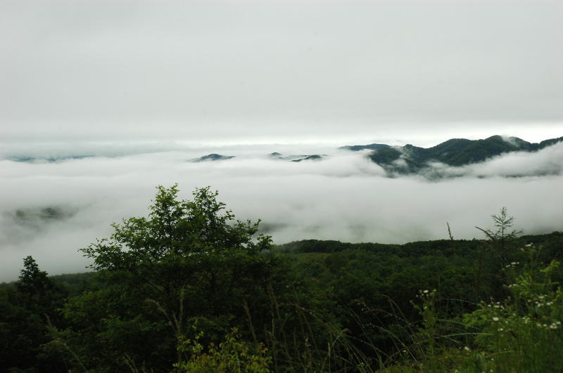 | 然別峡野営場から今日宿泊する山田温泉まで林道で行こうとしたものの、途中通行止めで断念。しかたなく13Km戻って、道道鹿追糠平線にでた。途中で久しぶりの雲海を見て、車を停めた。そこにはヤナギランが一本だけ華麗に花を咲かせていた。 神秘の湖、然別湖は霧に覆われ、より神秘的に見えていた。 |