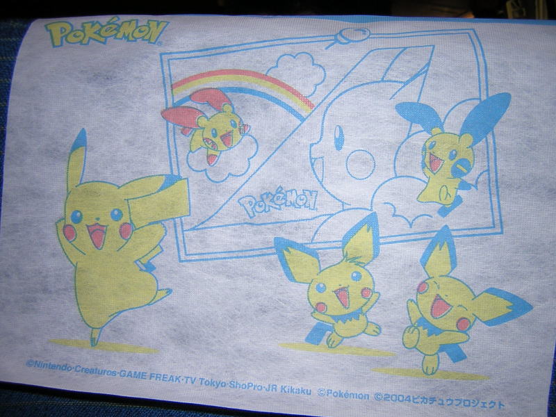 中目黒を5時30分に出発して、タクシーで天王洲アイルへ。モノレールで空港第2ビルへ向かい、ANA051便はポケモンジェットだった。機体のほか、背もたれのシート(写真)、客室を仕切るカーテン、紙コップなどにビカチュウが描かれている。ポケモン自体なんだかよくわからないが、なんとなく楽しい気分になる。 |