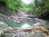 | 次の訪れたのは、然別峡・鹿の湯! 以前この近くの菅野温泉に宿泊したことがあり、鹿の湯の存在は知っていたのだが、訪れるのは今回が初めて。 写真のように川沿いに湧いた、掛け流しで偽りない天然温泉だ。然別峡野営場の奥にあり、無料であるが掃除をしてくれる方に感謝をして寸志を置いてゆくのがマナーとなっている。 ところで温泉の印象。源泉はかなり熱いようだが、写真の一番広い浴槽はちょうどよい温度となっている。もしかする前に入った人が川の水でうめているのかも?とにかく大自然の中で気持ちいいことこの上ない! 脱衣所に囲いはなく、脱いだものを置く棚があるだけ。女性にはちょっとハードルが高いかもしれない。 |