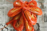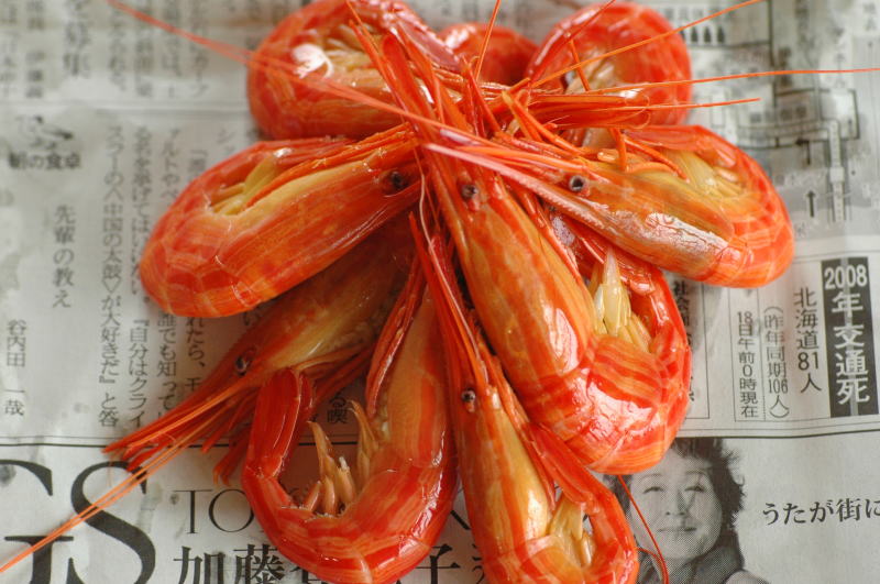 野付湾を望む尾岱沼の名物といえばこの北海シマエビだ。シマエビは野付湾のアマモの中に生息する。漁はスクリューでアマモを傷つけないよう打瀬舟という風帆船で行われる。漁期は6月中旬頃から7月まで(秋にもひと月程度の漁期がある)。この日は北海シマエビ解禁初日で冷凍していない北海シマエビを食べることが出来る貴重な時期なのだ。野付漁業協同組合直営店海紋では量り売りの北海シマエビを店内で食べることが出来る。塩茹でのえびは絶品でビールの友に最高なのだが、それは夜まで我慢しなくては。 |