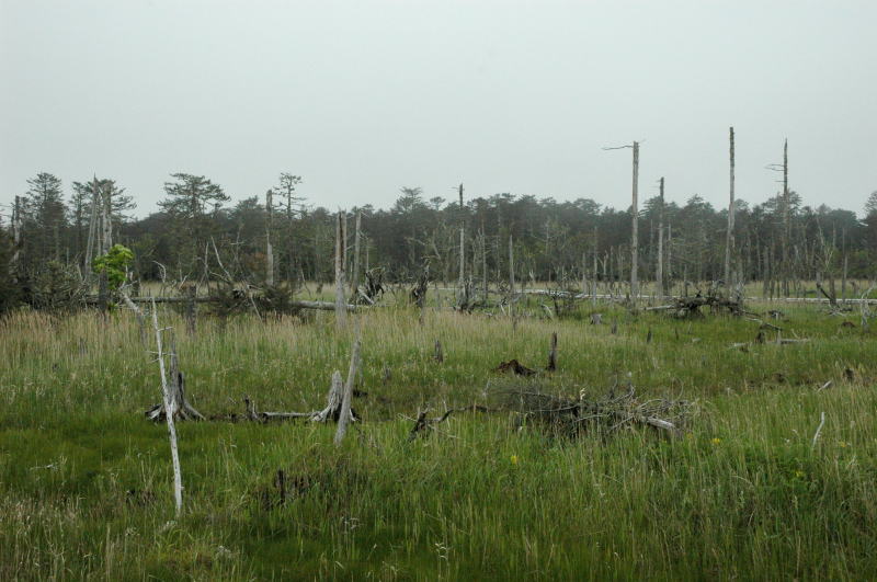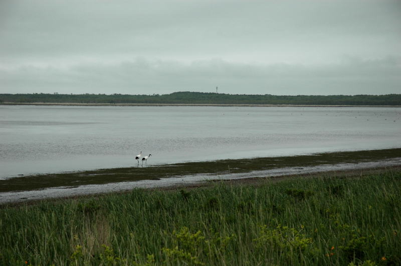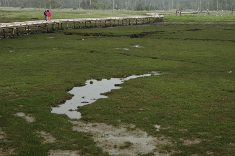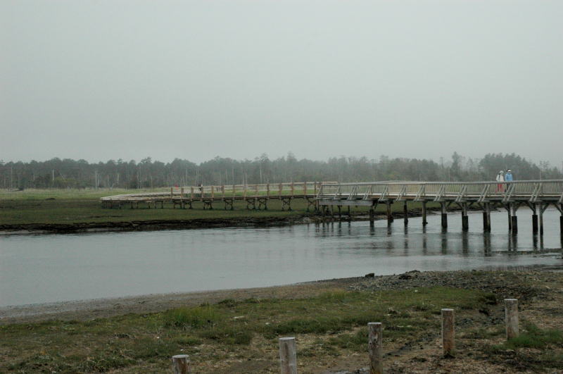 | 春国岱(しゅんくにたい)は不思議なところ 今回根室を訪れることになり、春国岱を始めて知ることとなった。白鳥で有名な風連湖と根室湾の間に横たわる大きな砂州である。 春国岱ネイチャーセンターで情報を仕入れる。気温が低いので虫はいない模様。ここを訪れるときにはやぶ蚊対策は必須で、刺されるとかなり腫れるらしい。駐車場に車を停めて熊よけの鈴をつけて出発した。 始めはヒバリコースでまっすぐな木道だ。時々エゾツルキバイなどが見えるものの退屈なコース。湿原に丹頂の姿を探すが、動くものは遠くの道路を走る車ばかり。途中ヒバリコースとキタキツネコースの分岐に当たる。ウミミドリを撮ったのはこのあたりだ。キタキツネコースは付近にキタキツネの巣があるいう藪の中。ヒバリコースの何もない湿原とはちょっと違った雰囲気である。トドワラ(トドマツが立ち枯れているが気温が低いために朽ちずにそのまま残った風景)やトドワラ一歩手前といった風景が広がる。ほとんどの木にサルオガセがついて、樹木に勢いがないことが感じられる。 キタキツネコースの奥のアカエゾマツコースに行くと景色が一変し原始林という雰囲気となる。アカエゾマツ、トドマツのうっそうとした森で地面には羊歯が大きな葉を誇っている。これだけ狭い地域に、さまざまな自然の様子を見ることが出来る春国岱は不思議でもあり、貴重な場所でもある。 この日はあいにくの曇り空。最高気温が10度前後で、吹きっさらしの木道を歩くにはちょっとつらい。春国岱を早々に後にして、近くの道の駅すわん44ねむろに向かった。風連湖を望む館内は野鳥観察の場。望遠鏡のほかに操作可能なテレビカメラがあった。そのカメラで丹頂の親子を捉えることが出来た。今回の旅の丹頂一号は、肉眼では捉えることは出来ないものの、自分で見つけた満足感があった。 |