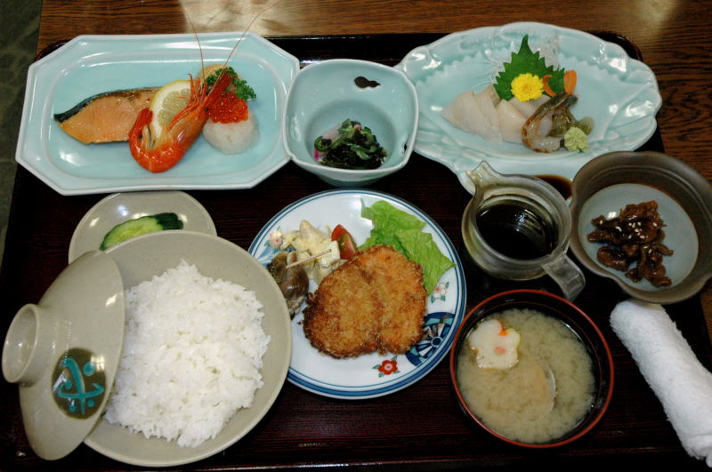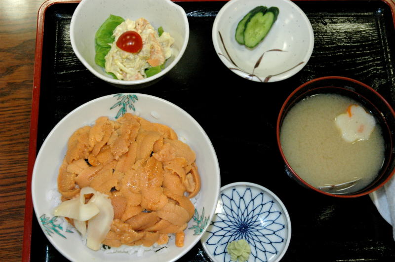 | 漁港の近くにある白帆というお店で昼食をとる。うに丼のおいしさは説明不要だろう。しまえび天丼はからっと揚がったシマエビをバリバリと頭から食すことが出来る。定食はシマエビの刺身、熟成秋さけ、ホタテフライなど豪華だ。すべてにアサリの味噌汁がついてくるが、このアサリも地元で取れた天然物でこの上ないうまさである。 | ||||||||||||||||||||||||||||||||||||