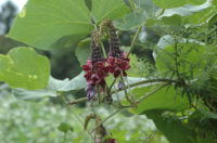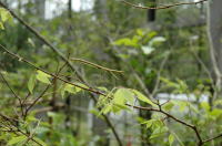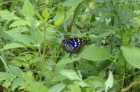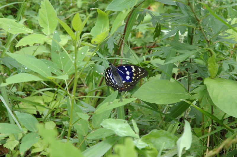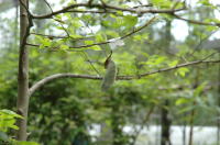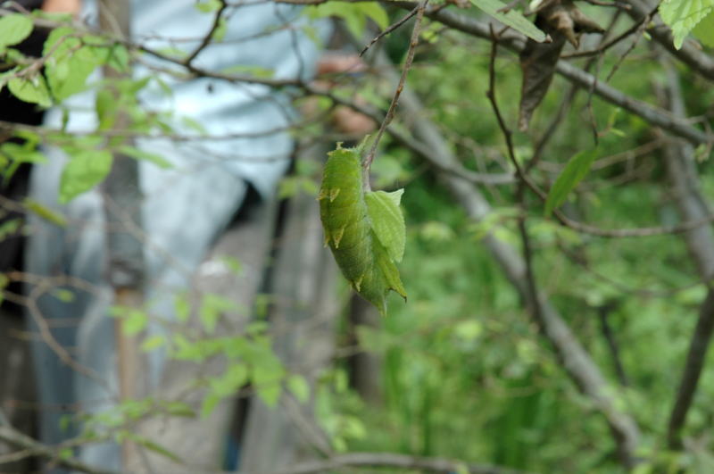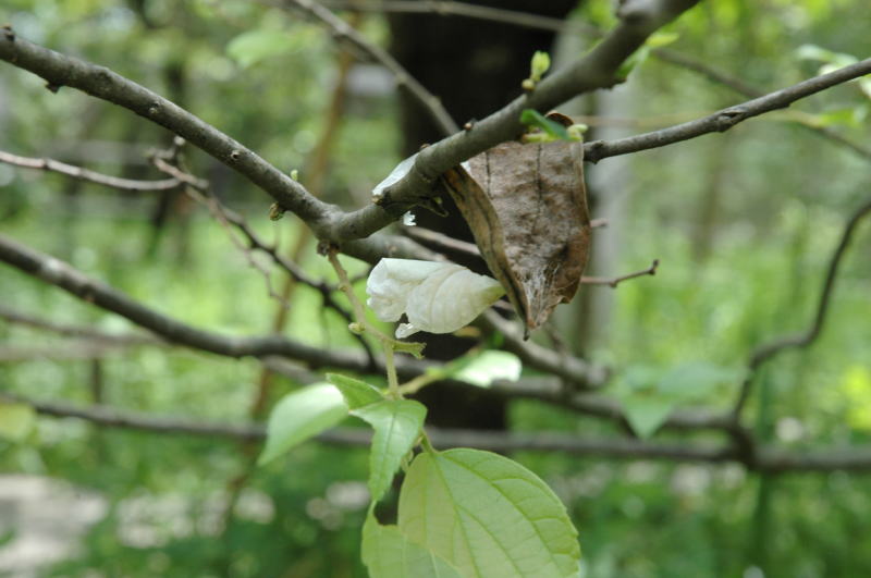| 前日の大雨の影響でオオムラサキの成虫は少ない。シーズン始めということでこれまではあまり目にすることのなかった抜け殻が見られたり、幼生を見ることが出来た。 羽化直前のさなぎがテープで張ってあるのは、羽化の様子を来場者に見せようというセンターの方の気配りだ。このあとすぐ、このさなぎが羽化して見学者を楽しませた。 |