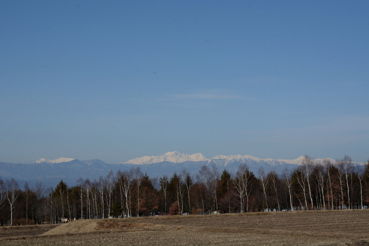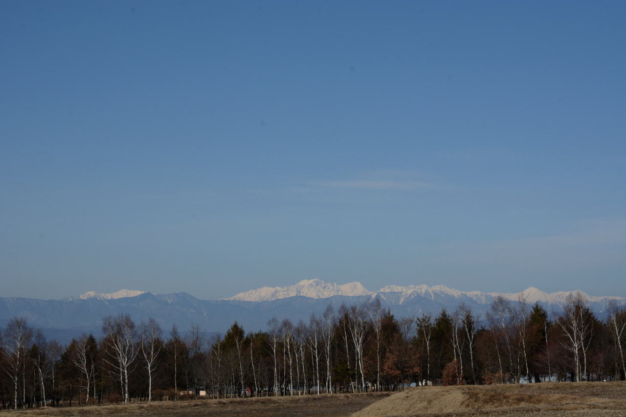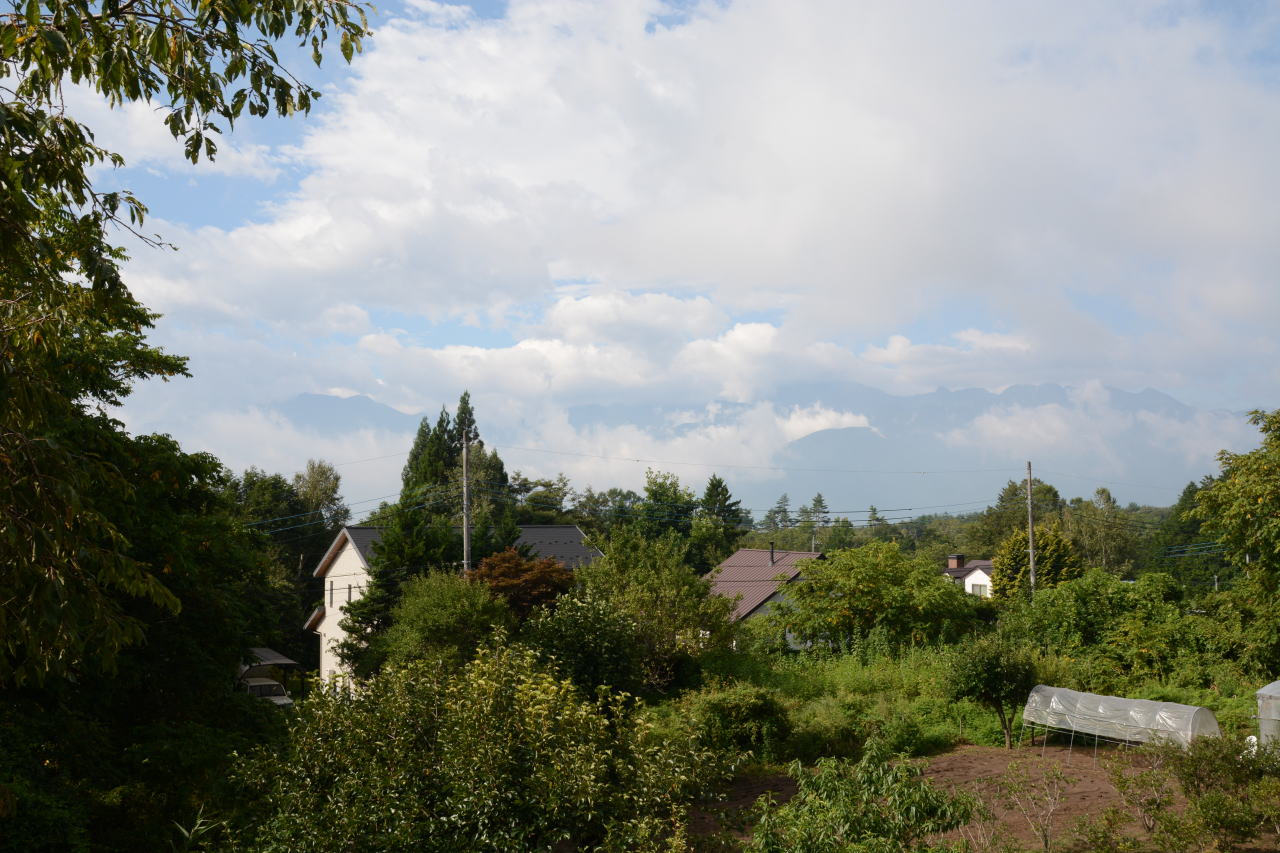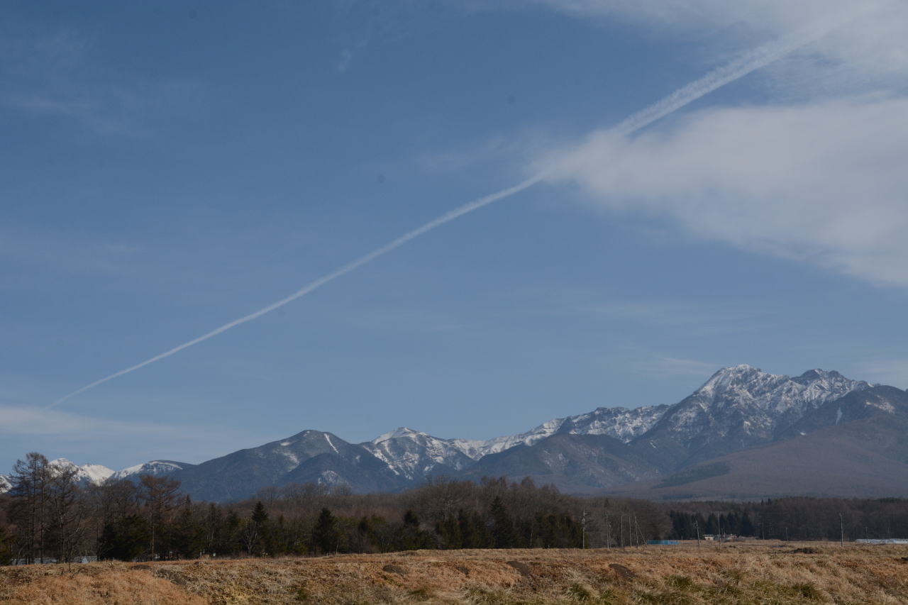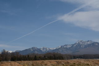 | たてしな自由市場へ向けて出発。天気は下り坂のようで、ひこうき雲がきれいだ。この日は水曜日で行ってみたら市場はお休み、北アルプスの写真を撮って時間をつぶす。 | ||||||||||||||||||||||||||||||||||||