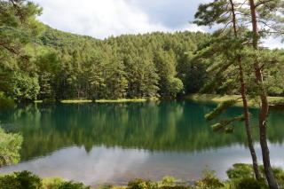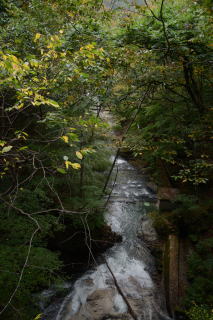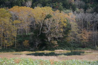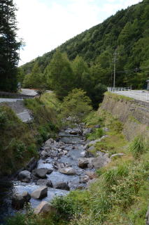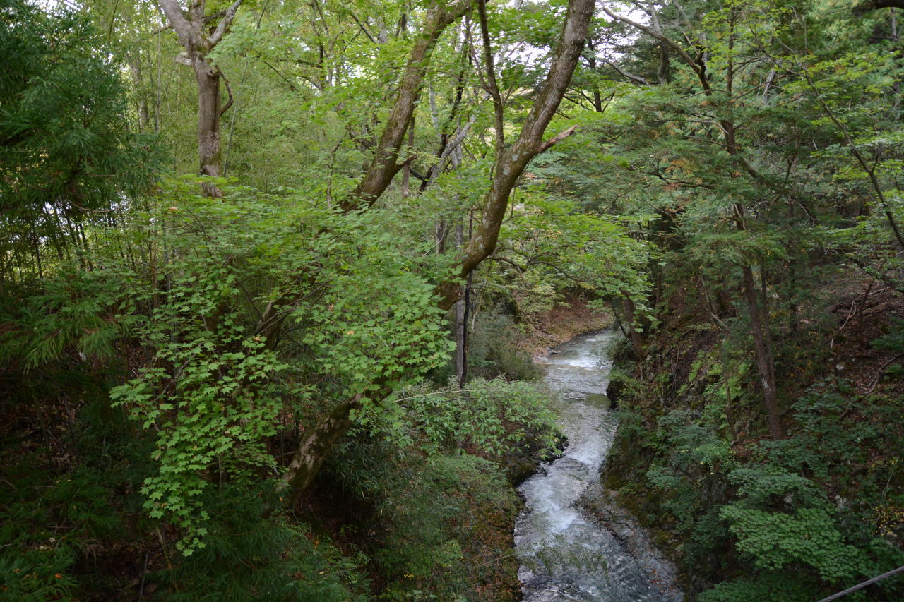 東山魁夷画伯の『緑響く』の舞台とされた御射鹿池は駐車場が整備され、大型観光バスもやってくるようになった。ちょっと残念に思うのだが、奇麗な景色だし、観光資源としたい地元のニーズも理解できる。明治温泉はこの駐車場から徒歩で行くことが可能で、明治温泉が混んでいるように見えたのは御射鹿池を訪れた観光客だろうか?明治温泉方面へ向かって行ったのは、温泉に入るためではなく横谷峡散策が目的だったのかもしれない。 |