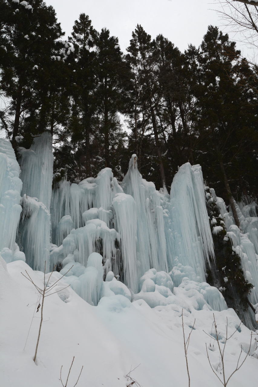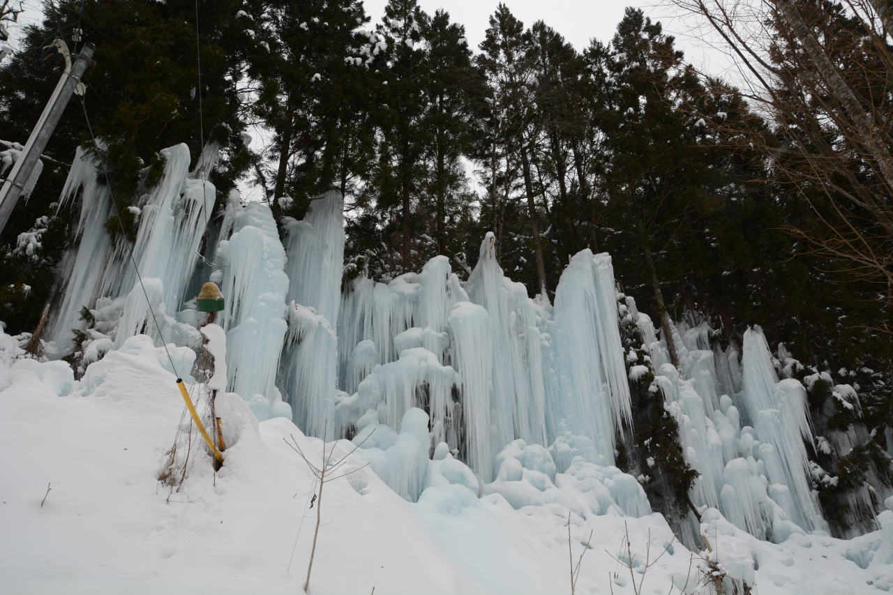 | 今年は2月4日から14日までライトアップを行っているとのこと。人工的に作っているものだけど氷柱の青が印象的だ。電線がちょっとフォトジェニックじゃない! |