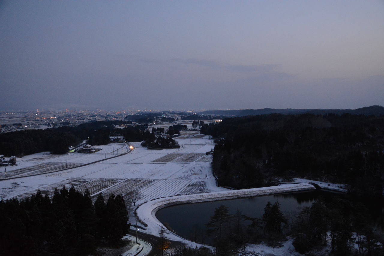 | 昨夜各自部屋へ戻り、私は温泉に入って寝つきはよかったのだが、明け方暗いうちから目が覚めて寝られない。朝陽が差し込む砺波の街を撮ろうと思ったのだが、曇り空だったためか思ったような写真にはならなかった。ゆっくりと朝食を済ませ、9時に支配人に見送られて出発。昨日到着時には雨が降っていたのだが、車にはうっすらと雪が積もっていた。 | ||||||||||||||||||||||||||||||||||||