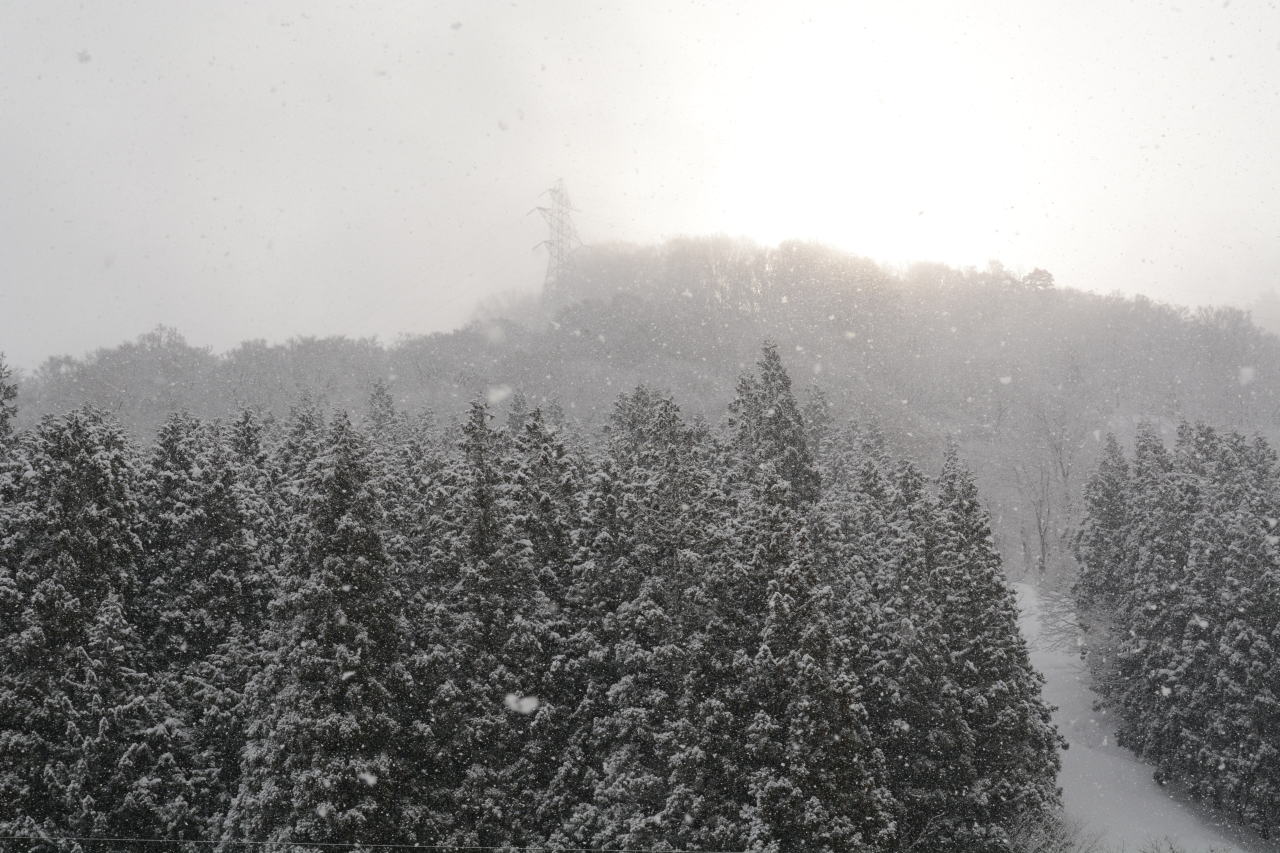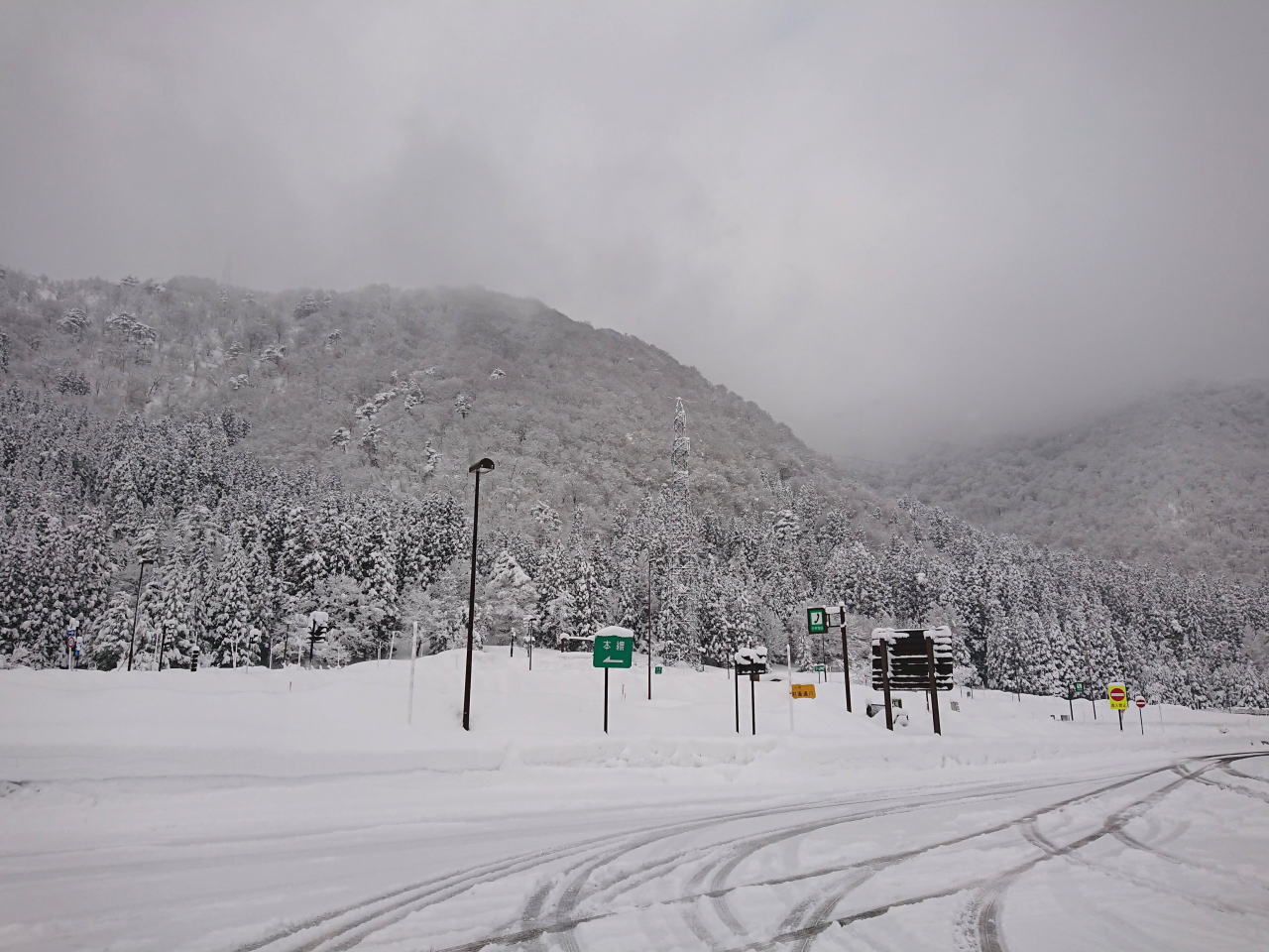 写真はXperia東海北陸自動車道飛騨白川PAは積雪有。ここまで高速の路面は積雪なしのウェット状態。半分以上トンネルなので、運転に支障はない。50km制限の割に流れは80kmを超えている。新雪が木に降り積もり、トンネルとトンネルのあいだから見える景色はとてもきれいだった。 |