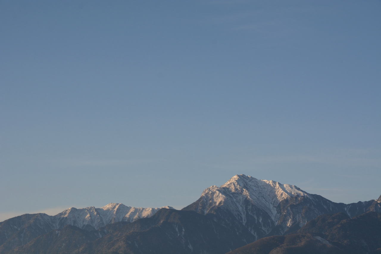 | 明け方の気温も変わらず氷点下4度。昨晩布団が温まるまで布団の中で震え、トイレが我慢できなくなると意を決して布団から出なければならない。室内も氷点下ではないかと思うくらい寒いが、ペットボトルの水が凍らないので一応プラスは保っているようだ。 甲斐駒ヶ岳や北岳に朝陽が当たる「赤駒」を狙ったのだが、曇りだったことと時間が遅かったことが重なり失敗。Xperiaで撮った右の写真のみ、斜面に朝陽が当たり赤くなっている様子。 |