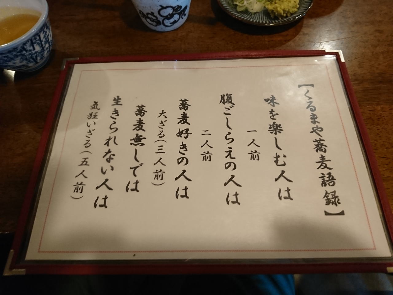 | 写真はお参りしてからそばを食べに行ったように並んでいるが、本当は逆で蕎麦を食べてから神社へお参りした。くるまやさんはすごい人気で、11時開店で12時前には空席待ちの人たちが並んでいた。蕎麦はおいしく、一人前で十分な量。大ざる(三人前)なんか、食べきれないと思うが山もり蕎麦があちこちのテーブルに運ばれてゆく。もつ煮は珍しく馬もつだ。ネットで調べるとクックパッドのレシピが紹介されているくらいだから、それほど珍しくないのかな? | ||||||||||||||||||||||||||||||||||||