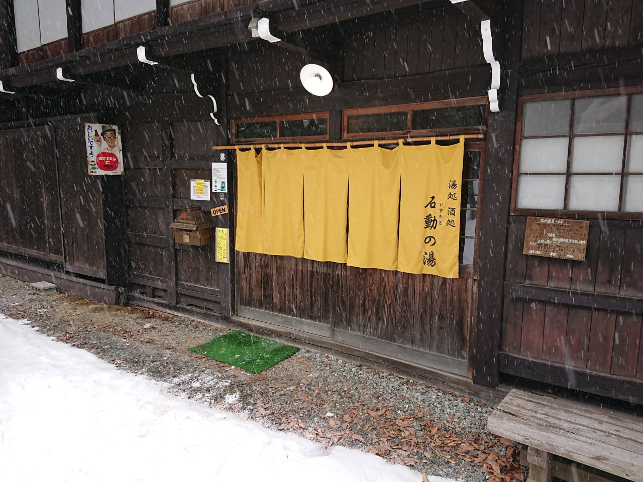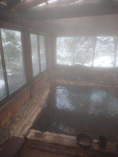 | ひらゆの森での温泉を予定したのだが雪も降っており、「露天はいらない」とのご希望。福地温泉昔ばなしの里石動の湯へ行った。おくひだおんせんきょうふくちおんせんだと思っていたのだが、奥飛騨温泉郷(おくひだおんせんごう)福地温泉(ふくじおんせん)だそうです。福地温泉の日帰り温泉施設は休業しているということをどこかネットで見かけたのだが、2018年12月26日から再開し、料金は300円に値下げしたとのことだ。冬季露天風呂は休業で内湯のみだが、内湯の風呂の底は一枚岩のようだ。かけ流しの湯で雰囲気泉質共に抜群。 | ||||||||||||||||||||||||||||||||||||