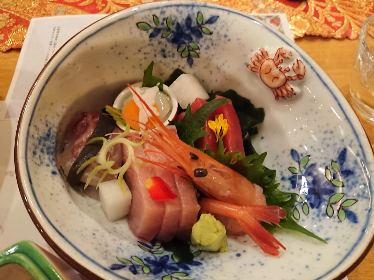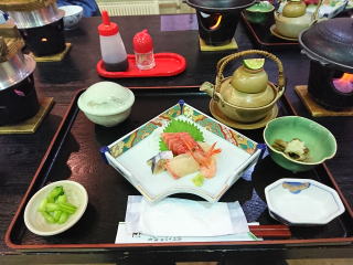 | 支配人と旧交を温め、夕食は富山のおいしいお酒をいただきながら堪能。食事に集中して写真はほとんど撮らなかったのだが、お造りの器のカニがかわいくて写真に撮った。お造りは白エビ、鯛のコブジメ、日本海の天然ブリ、甘えびとマグロ。 部屋へ戻って昔話に興じたり、ゲームをしたりと楽しい時間でした。冬の北陸はくせになる。 |