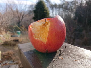 写真はXperia小鳥のためのリンゴ。出かけるときは食べ跡はなかったのだが、二日経っていくらか小鳥のお腹を満たしたようだ。 |