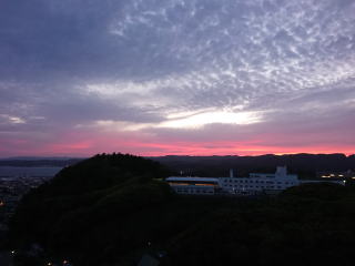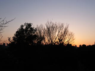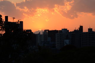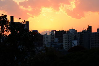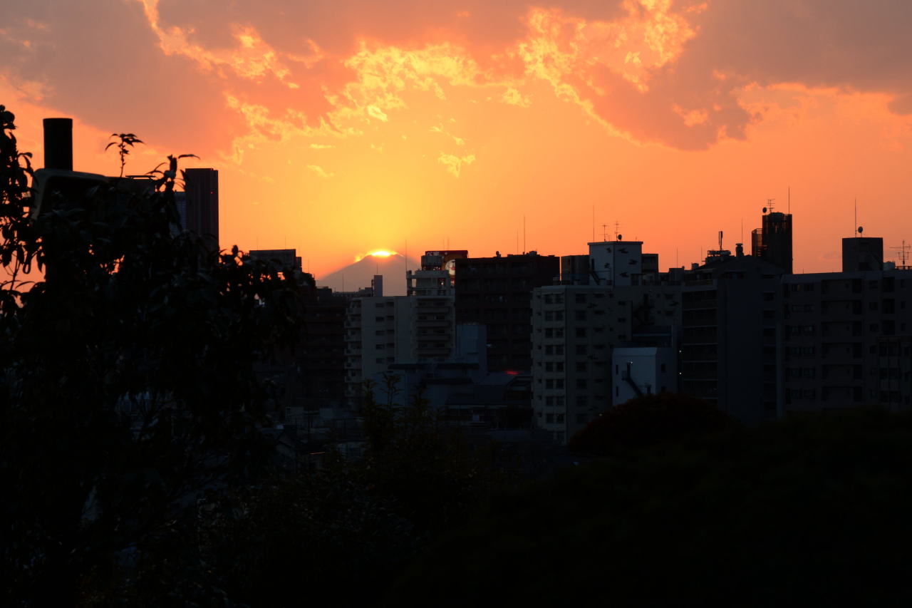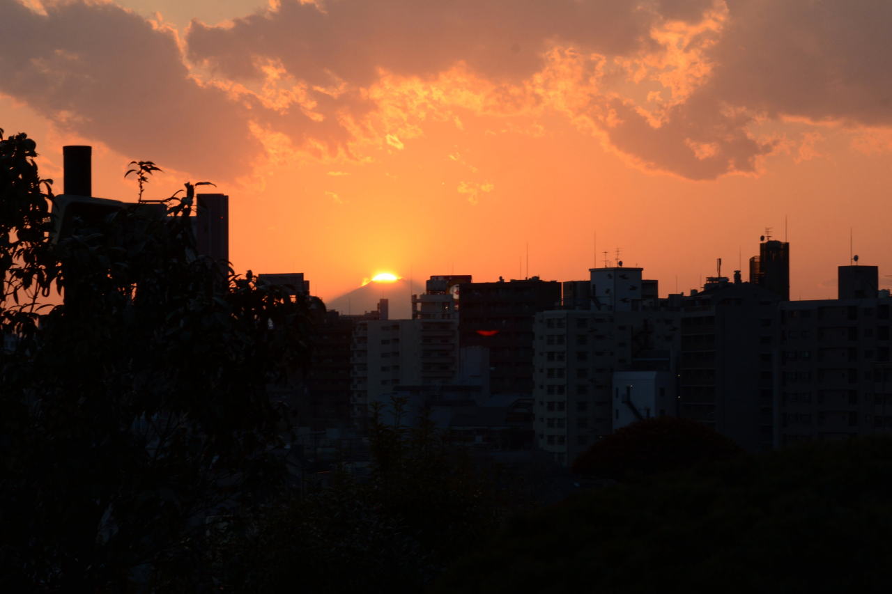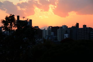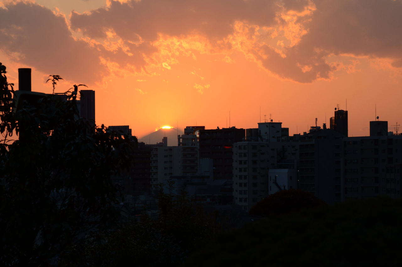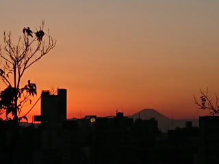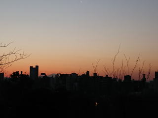 前日の失敗。調べてみると11月3日頃と2月6日頃、天空庭園から見て富士山に夕日が沈むとのこと。2月6日日没時間を調べて天空庭園へ向かう途中、東山小学校辺りで大きな夕日が見えており、天空庭園についた時にはすでにお日様は沈んだ後だった。 |