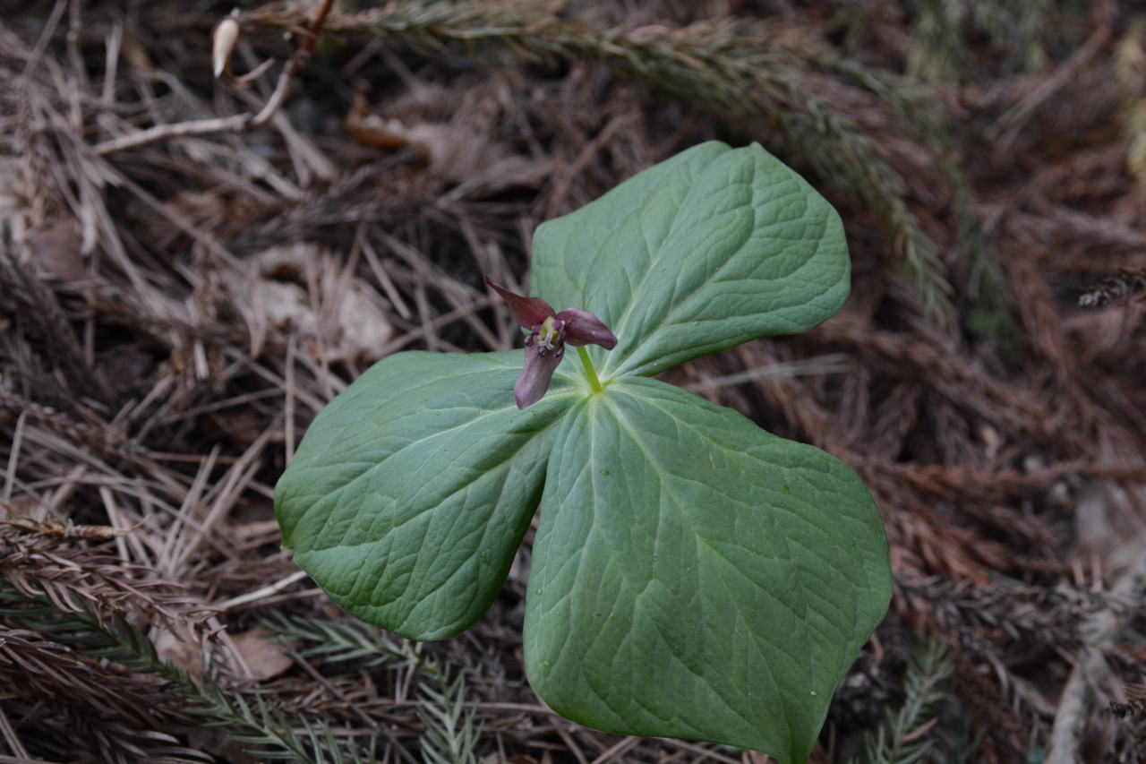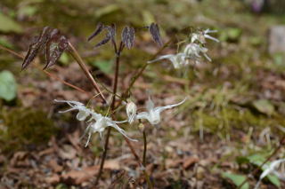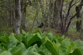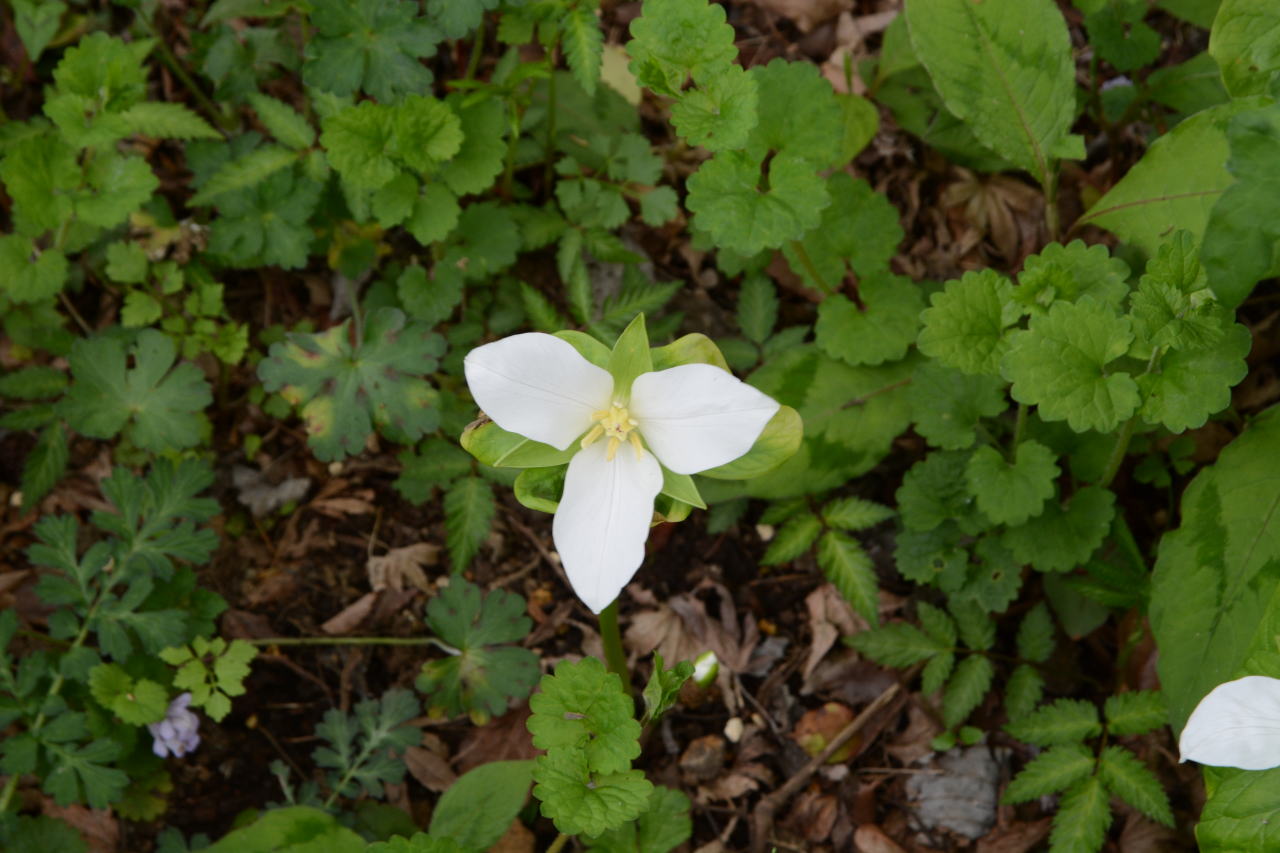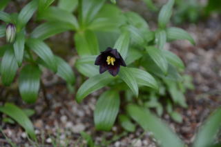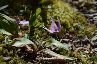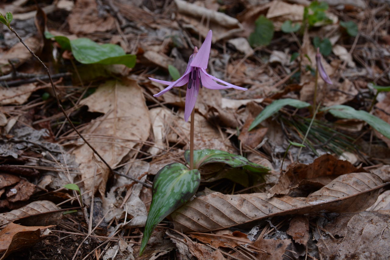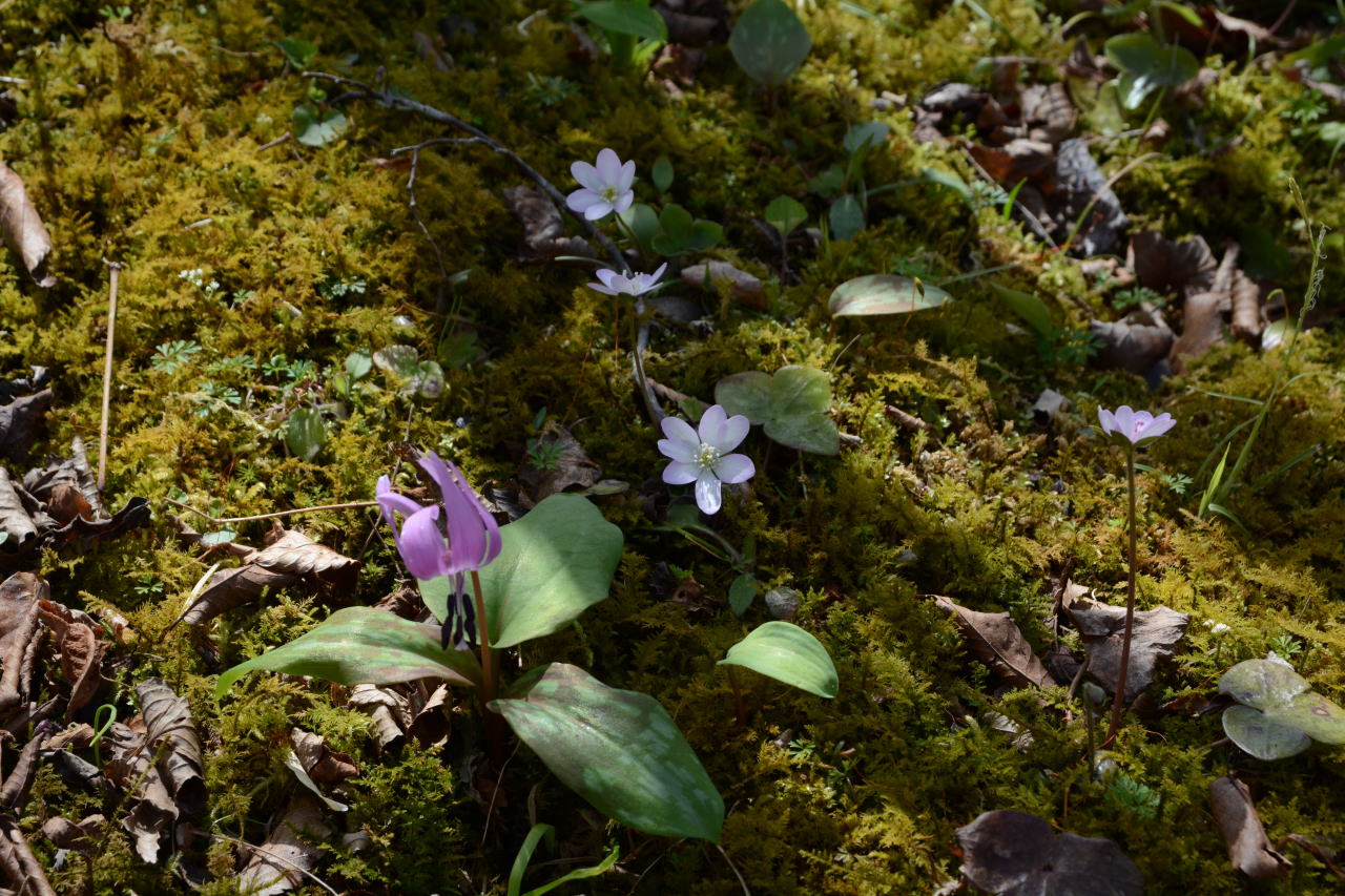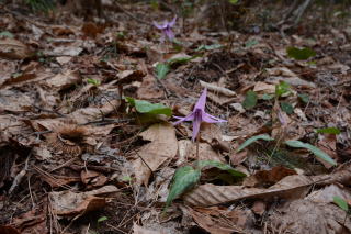 | 道の駅猪苗代でトイレ休憩をして次の目的地を土湯温泉より少し福島駅寄りの四季の里に定めて115号を走行。箕輪スキー場あたりではまだ雪が残っている場所がある。長い土湯トンネルを抜けると少し明るくなり、薄日もさし始め雨はほとんどやんだので、目的地を仁田沼駐車場に変更した。 ミズバショウが見頃を迎えているという仁田沼(にだぬま)には向かわず、駐車場近くにあるショウジョウバカマ群生地を目指すことにして歩き始める。ぬかるみがあり断念して車へ戻ろうとしたとき、林の中にカタクリを発見。よく見まわしてみるとショウジョウバカマもぽつぽつ見えた。駐車場まで戻ってくると目が慣れたせいかすぐわきにショウジョウバカマが見られた。エンレイソウは久しぶり、よく見るとそこそこの群生。 |