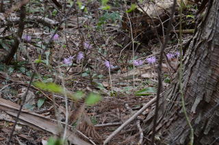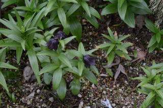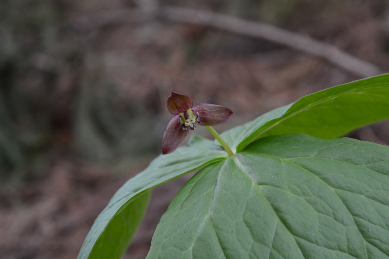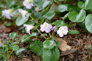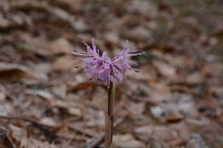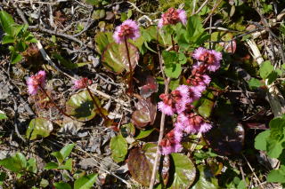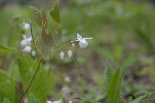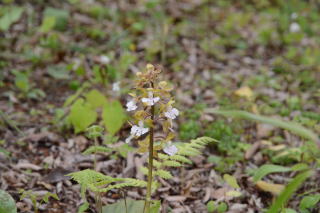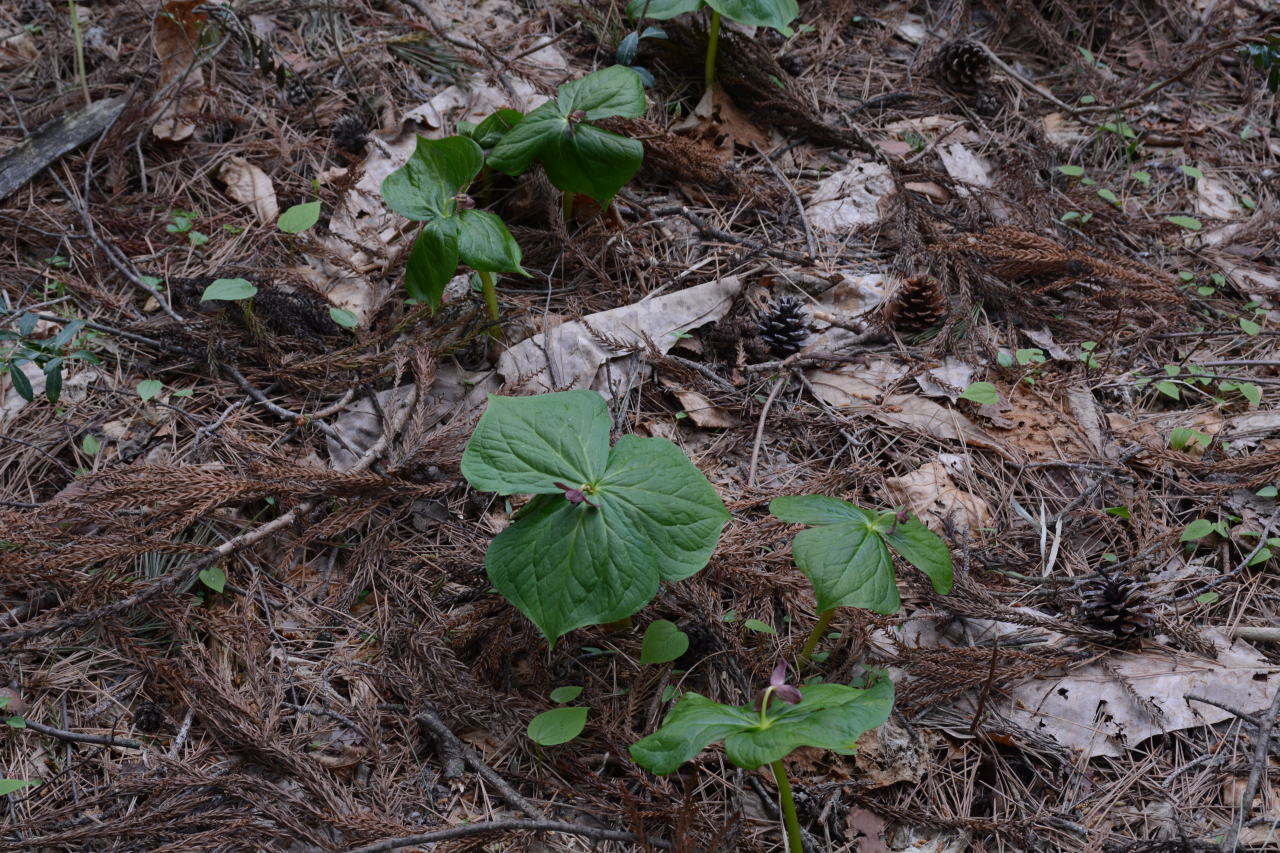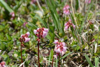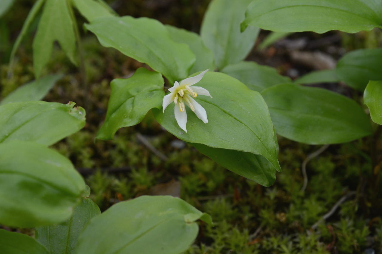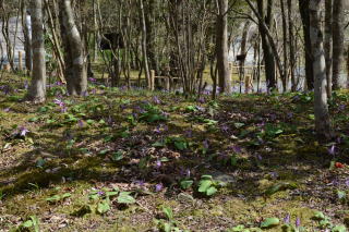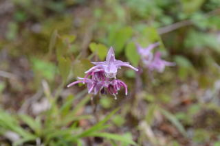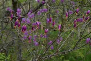 | 道の駅猪苗代でトイレ休憩をして次の目的地を土湯温泉より少し福島駅寄りの四季の里に定めて115号を走行。箕輪スキー場あたりではまだ雪が残っている場所がある。長い土湯トンネルを抜けると少し明るくなり、薄日もさし始め雨はほとんどやんだので、目的地を仁田沼駐車場に変更した。 ミズバショウが見頃を迎えているという仁田沼(にだぬま)には向かわず、駐車場近くにあるショウジョウバカマ群生地を目指すことにして歩き始める。ぬかるみがあり断念して車へ戻ろうとしたとき、林の中にカタクリを発見。よく見まわしてみるとショウジョウバカマもぽつぽつ見えた。駐車場まで戻ってくると目が慣れたせいかすぐわきにショウジョウバカマが見られた。エンレイソウは久しぶり、よく見るとそこそこの群生。 |
