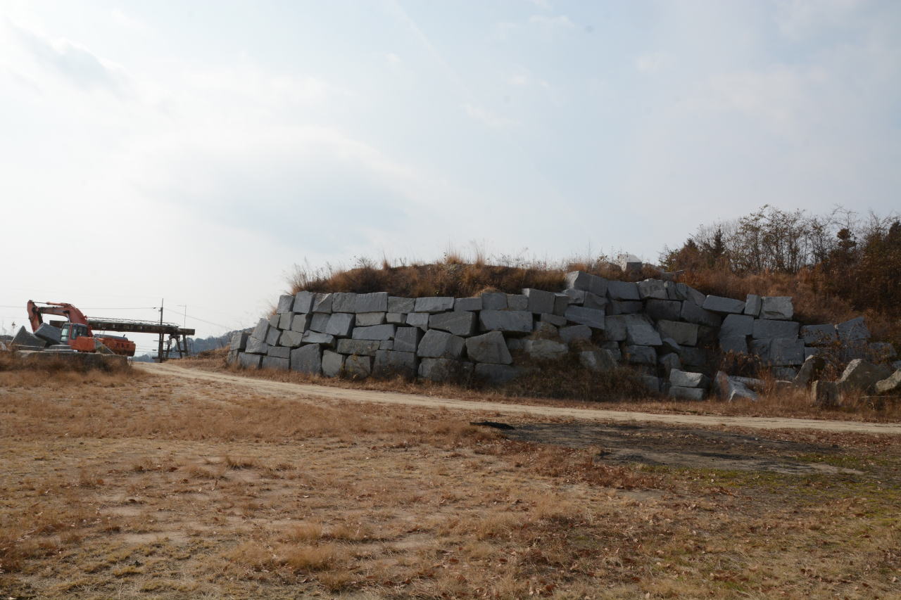 実測間口(東西)十四間、奥行(南北)七間(天平尺)の大堂でありました。○七重塔礎石、山門と金堂の中間右側にある石群が創草時の七重塔礎石であります。全ての国分寺は五重塔ではなく、七重塔であります。この塔址は心礎(中心柱が乗る礎石)と共に十七個あり、五間四方(正方形)の塔で、京都東寺五重塔(高さ東洋一)以上の規模の大塔でありました。