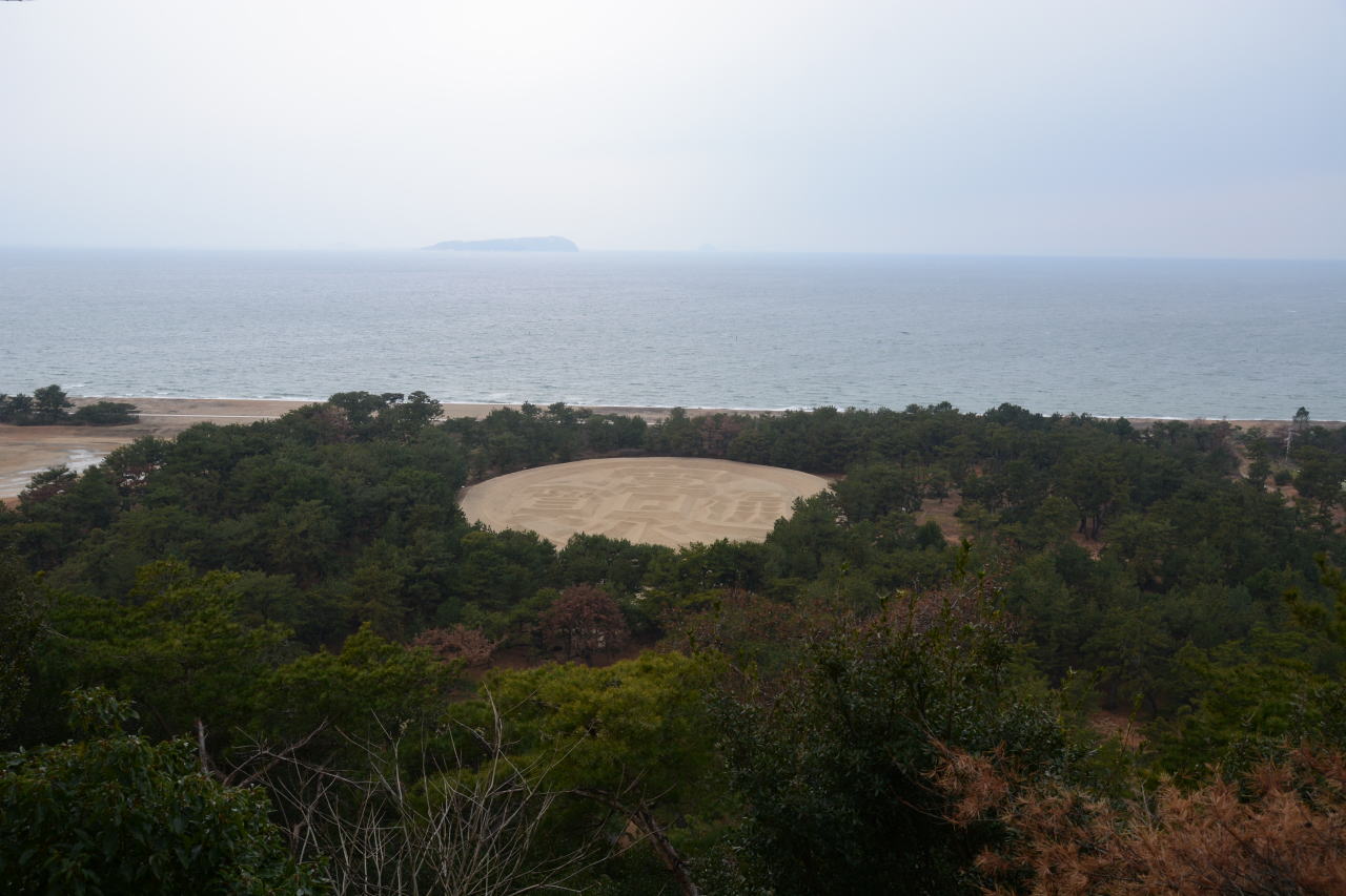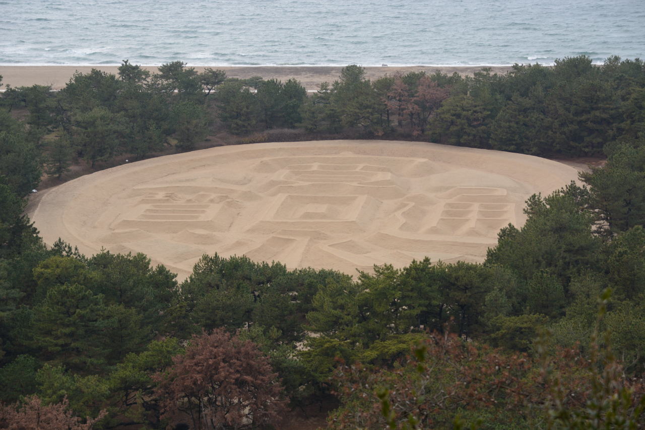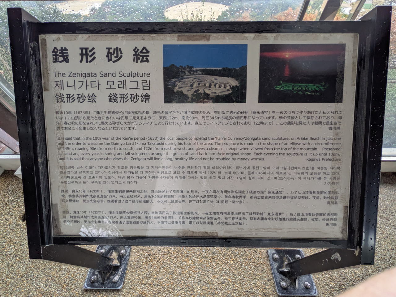 寛永10年(1633年)に藩主生駒高俊公が領内巡視の際、地元の領民たちが藩主歓迎のため、有明浜に銭形の砂絵「寛永通宝」を一夜のうちに作りあげたと伝えられています。山頂から見たときにきれいな円形に見えるように、東西122m、南北90m、周囲345mの縦長の楕円形になっています。砂の芸術として保存されており、毎年、春と秋に形をきれいに整える砂ざらえがボランティアにより行われています。夜にはライトアップもされており(22時まで)、この銭形を見た人は健康で長生きできてお金に不自由しなくなるといわれています。