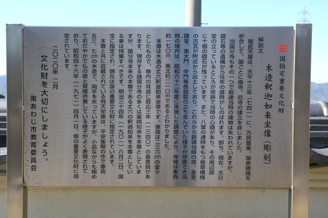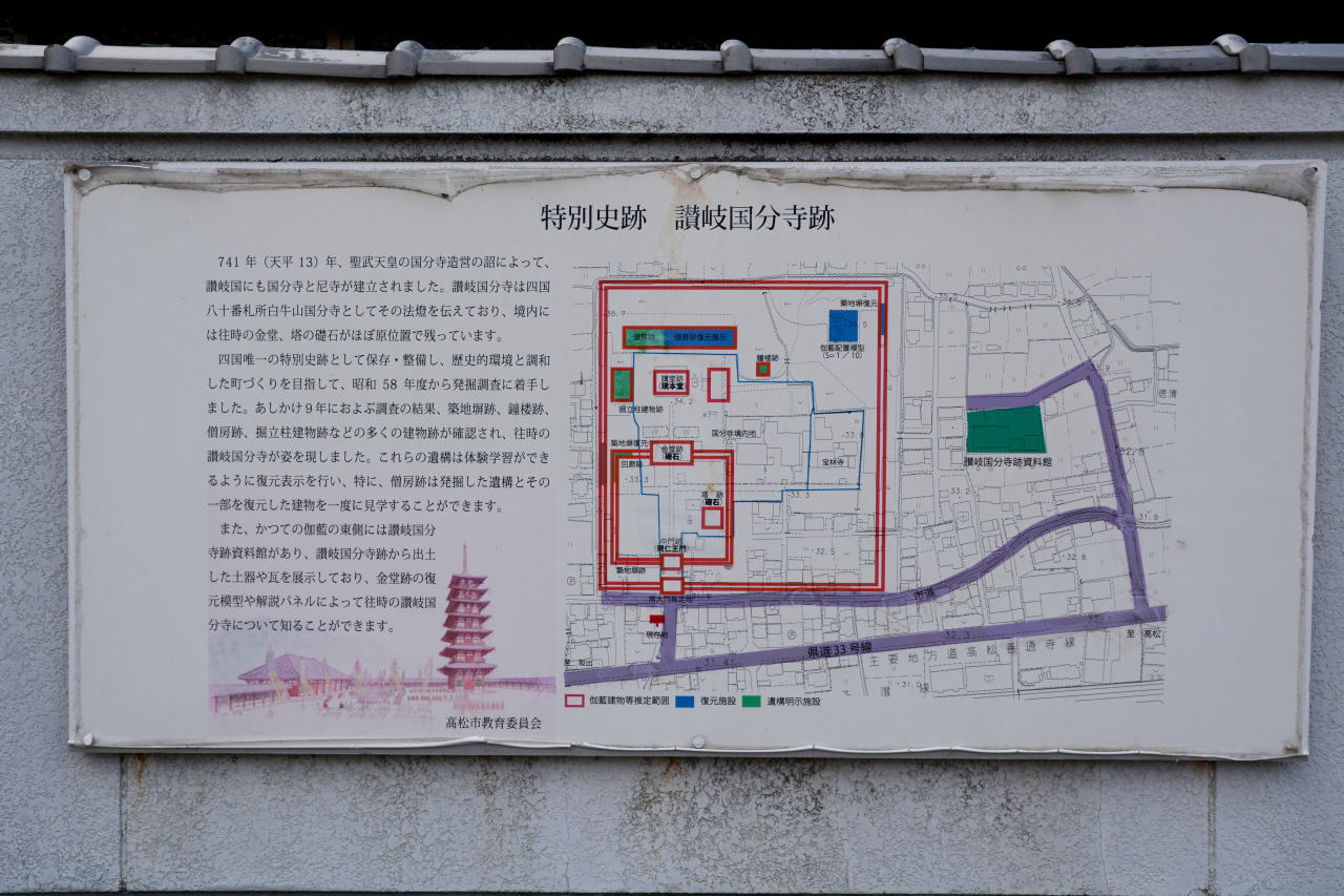 当寺の周囲には寺域を区画する築地の地割が残り、七重塔や金堂の礎石がはば原位置で残っています。これらは創建当初の伽藍をよくとどめる稀有な遺跡であり、四国で唯一、国の「特別史跡」に指定されています。詳細は右手の看板をご覧ください。