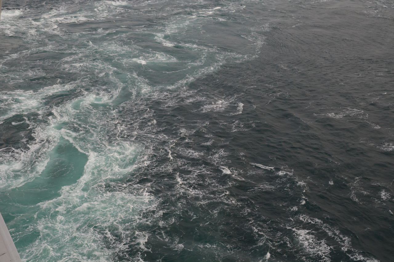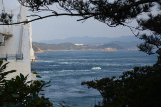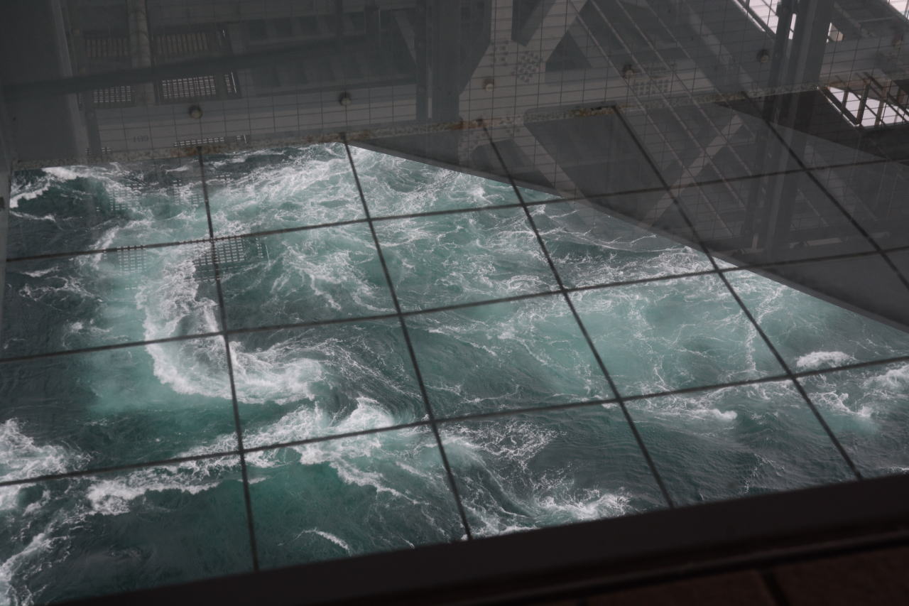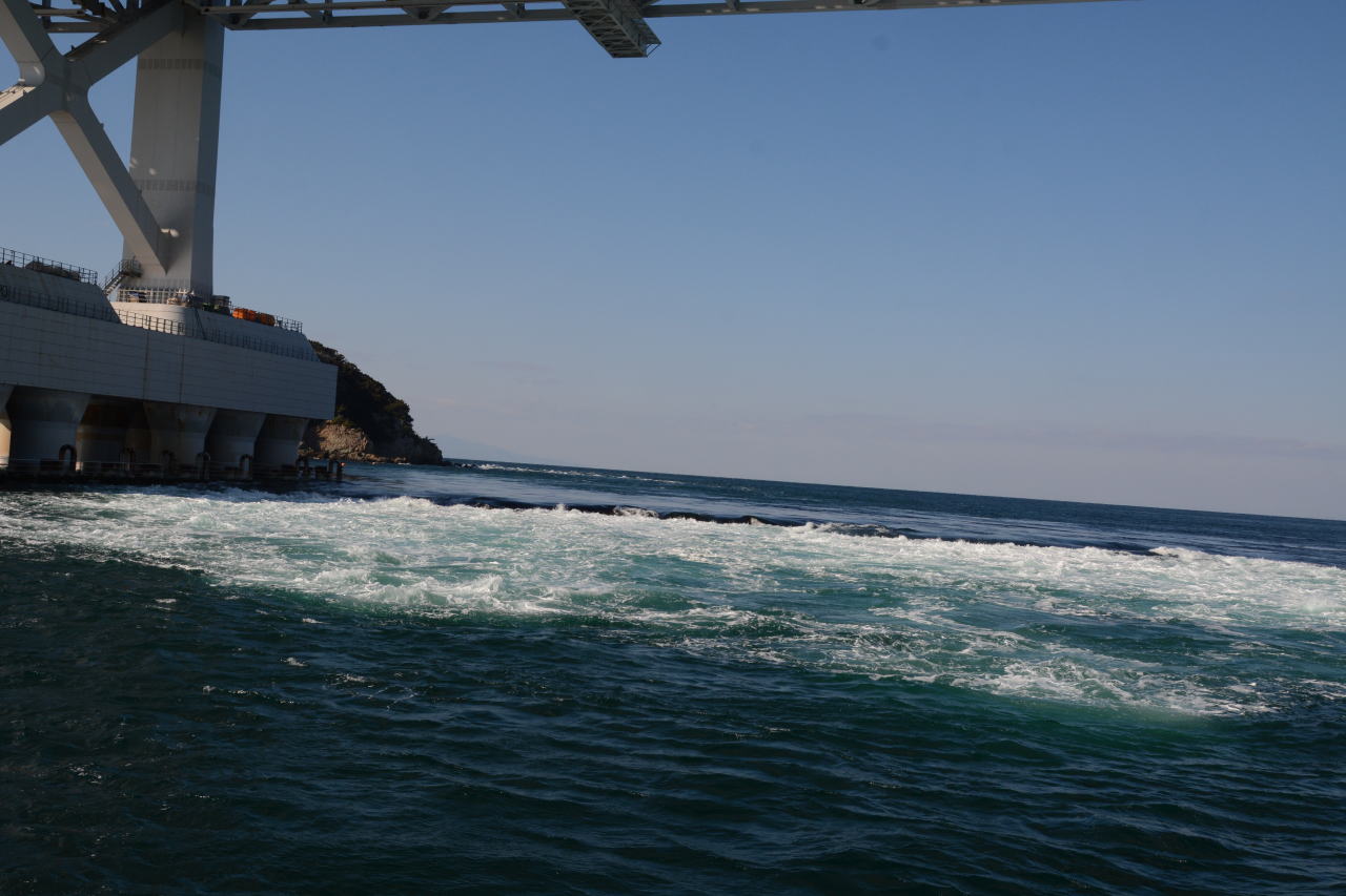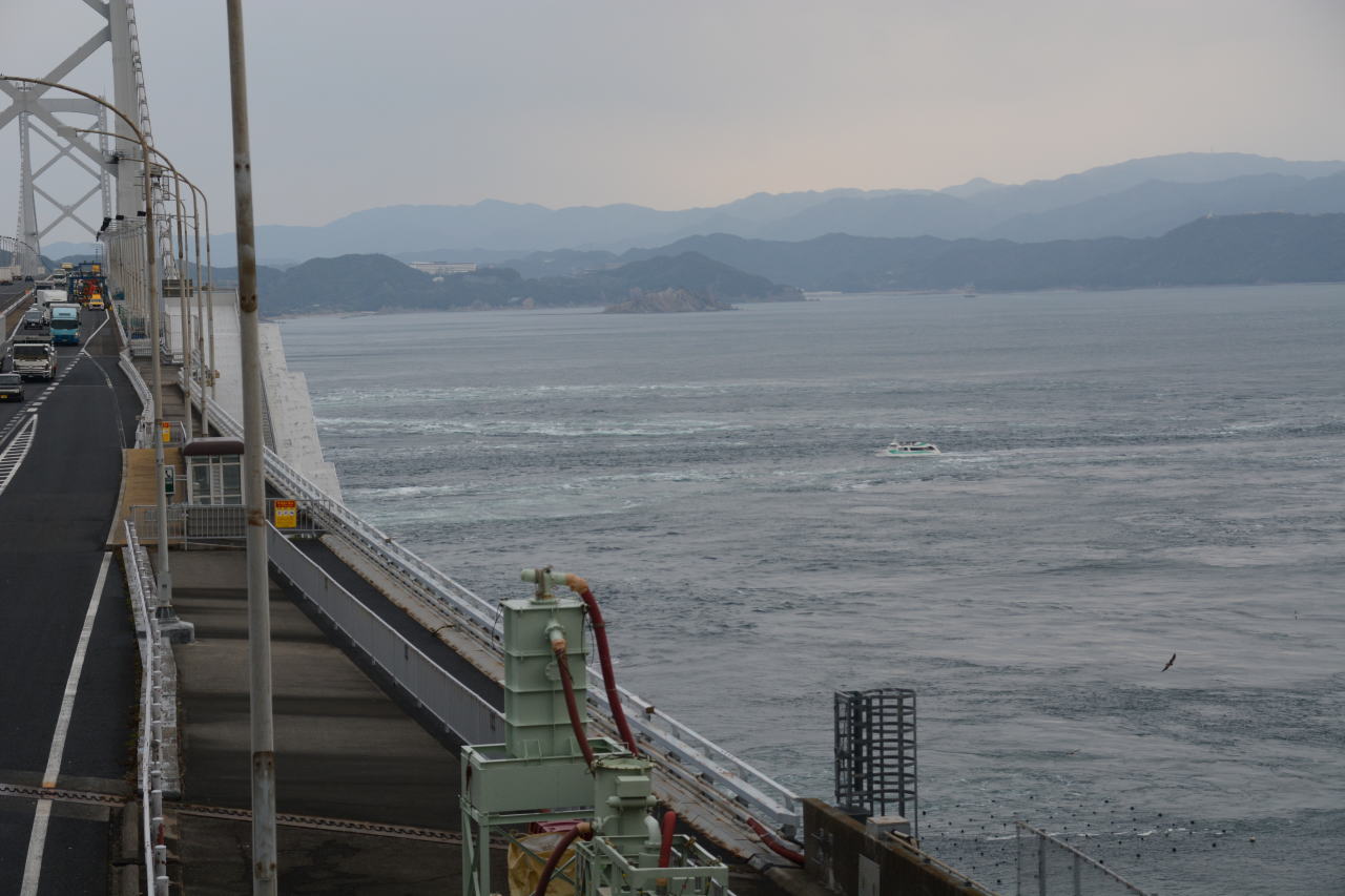 | 栗林公園を歩き回る体力はないと考え、翌日の観光予定地の大鳴門橋渦の道へ、渦潮は潮位の変化に影響されるため大潮や小潮によって状況が違うらしく、この日はかなりいい状態の渦潮とのこと。渦潮初体験。テレビなどで状況の良い渦潮を見ることはできるが実際に現地を訪れてみるべきものと強く感じた。渦の道はかなり風が強かった。 |