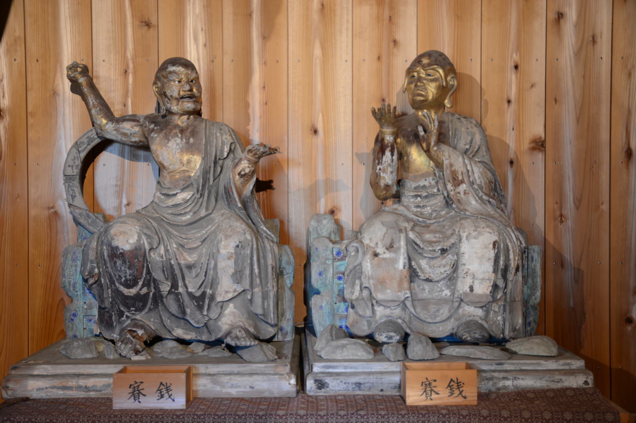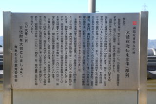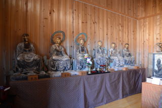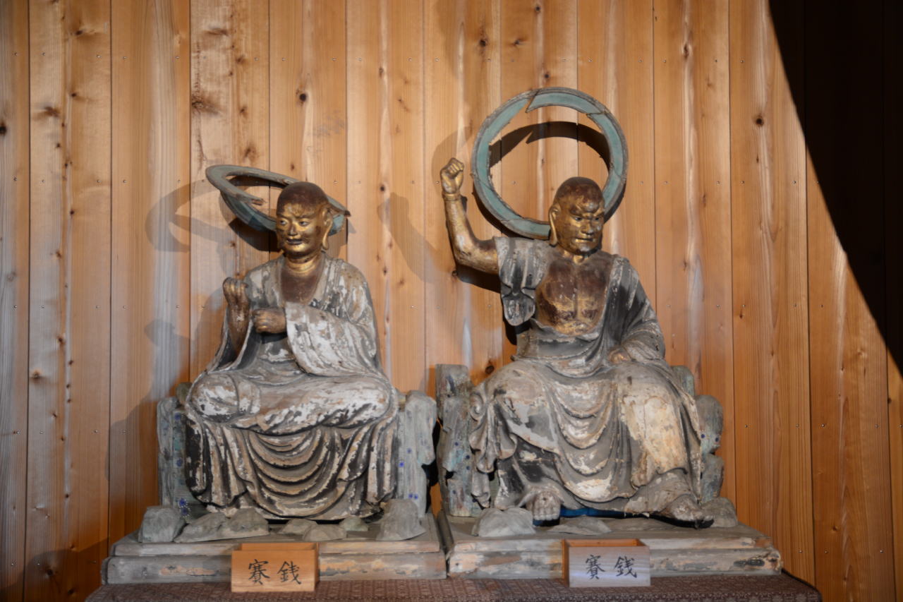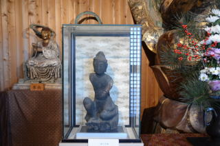 本尊と共に収蔵されている飛天坐像は、平安後期の作で像高五三、七pの木造で、両手を失っていますが、小品ながらも極めておだやかで仏の徳と賛嘆供養している様子がよく表現されており、昭和四十六年(一九七一)四月一日、県の重要文化財に指定されています。
