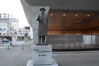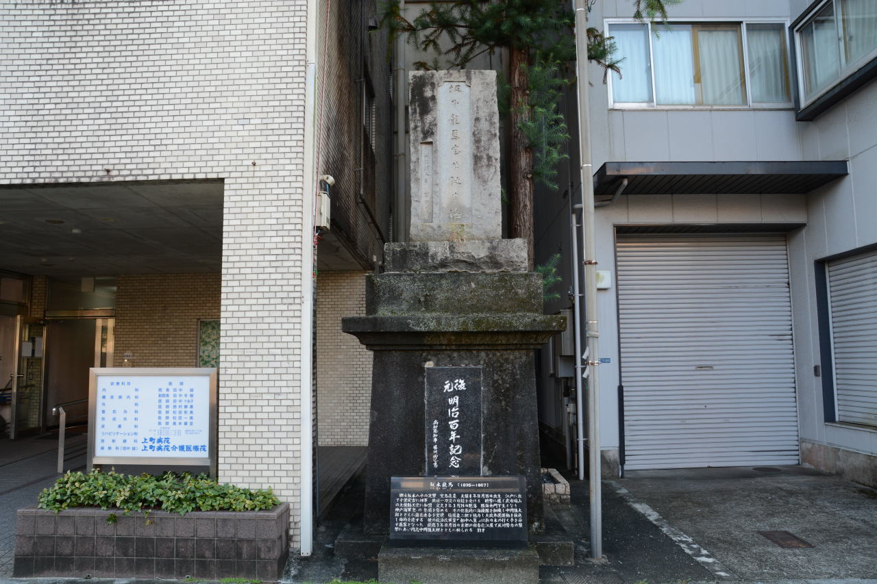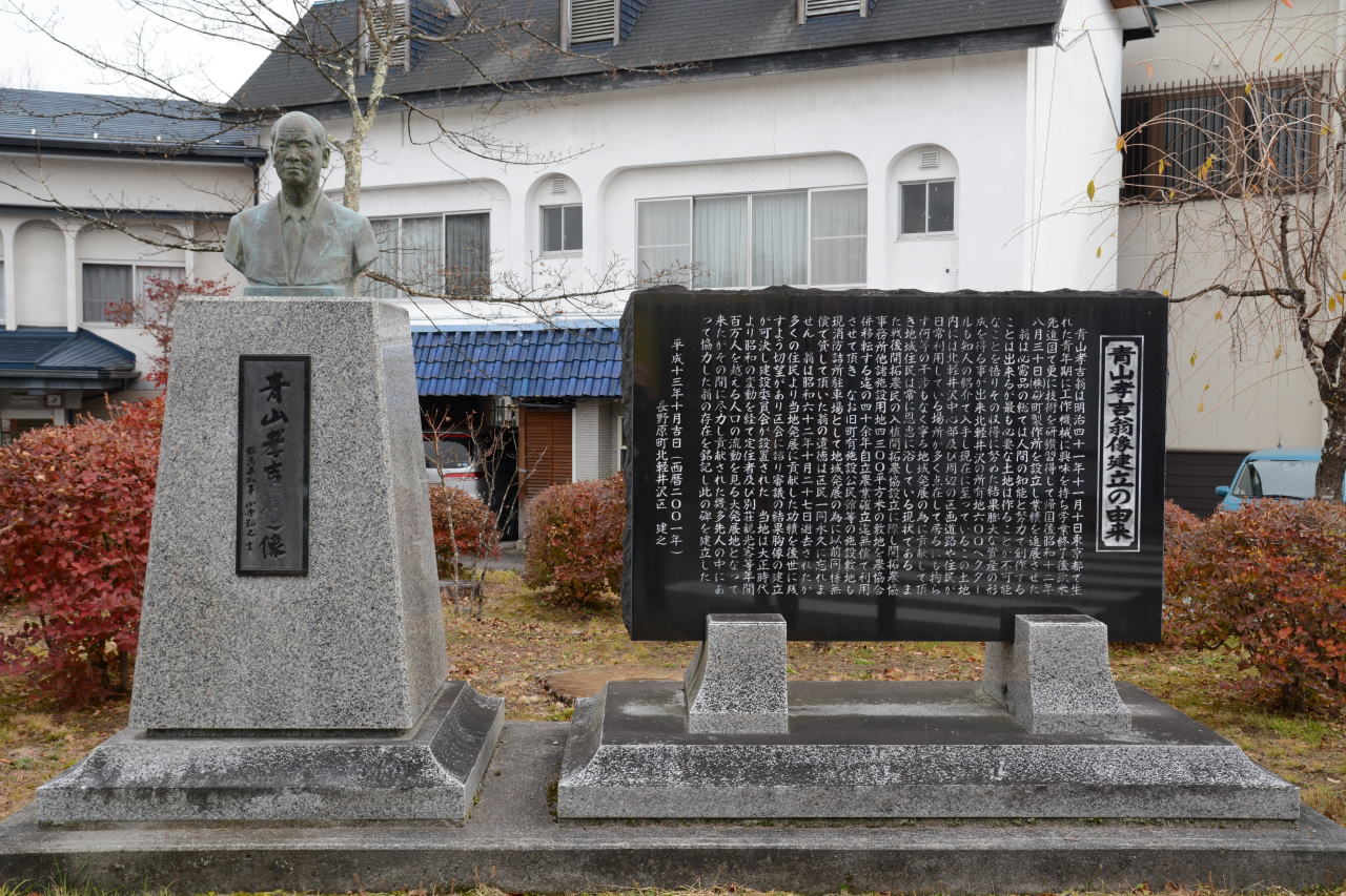 青山孝吉翁は明治四十一年十一月十日東京都て生れた青年期に工作機械に興味を持ち学業終了後欧米先進国て更に技術を研鑽習得して帰国後昭和十二年八月三十日轄サ町製作所を設立し業績を進展させた翁は必需品の総ては人間の知能と努力て創作することは出来るが最も必要な土地は作ることが不可能なことを悟りその収得に努めた結果膨大な資産の形成を得る事が出来北軽井沢の所有地六〇〇ヘクタールも知人の紹介て入手し現在に至っているこの土地内には北軽井沢中心部及び周辺の区画道路や住民が日常利用している場所が多く点在して居るにも拘らす何等の干渉もなく寧ら地域発展の為に貢献して頂き地域住民は常に恩恵に浴している現状であるまた戦後開拓農民の入植開拓農協設立に際し開拓農協事務所他諸施設用地四三〇〇平方米の敷地を農協合併移転する迄の四十余年自立農業確立迄無償て利用させて頂き なお旧町有施設公民館等の施設敷地も現消防詰所駐車場として地域発展の為に以前同様無償て貸して頂いた翁の遺徳は区民一同永久に忘れません 翁は昭和六十二年十月二十七日逝去されたが多くの住民より当地発展に貢献した功績を後世に残、すよう切望があり区会に諮り審議の結果胸像の建立が可決し建設委員会が設置された 当地は大正時代より昭和の変動を経て定住者及び別荘観光客等年間百万人を越える人口の流動を見る大発展地となって来たがその間に尽力し貢献された幾多先人の中にあって協力した翁の存在を銘記し此の碑を建立した
