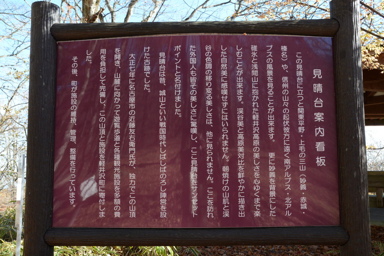 大正七年に名古屋市の近藤友右衛門氏が、独力でこの山頂を開き、山麓に向かって遊覧歩道と各種観光施設を多額の費用を負担して完備し、この山頂と施設を軽井沢町に寄付しました。