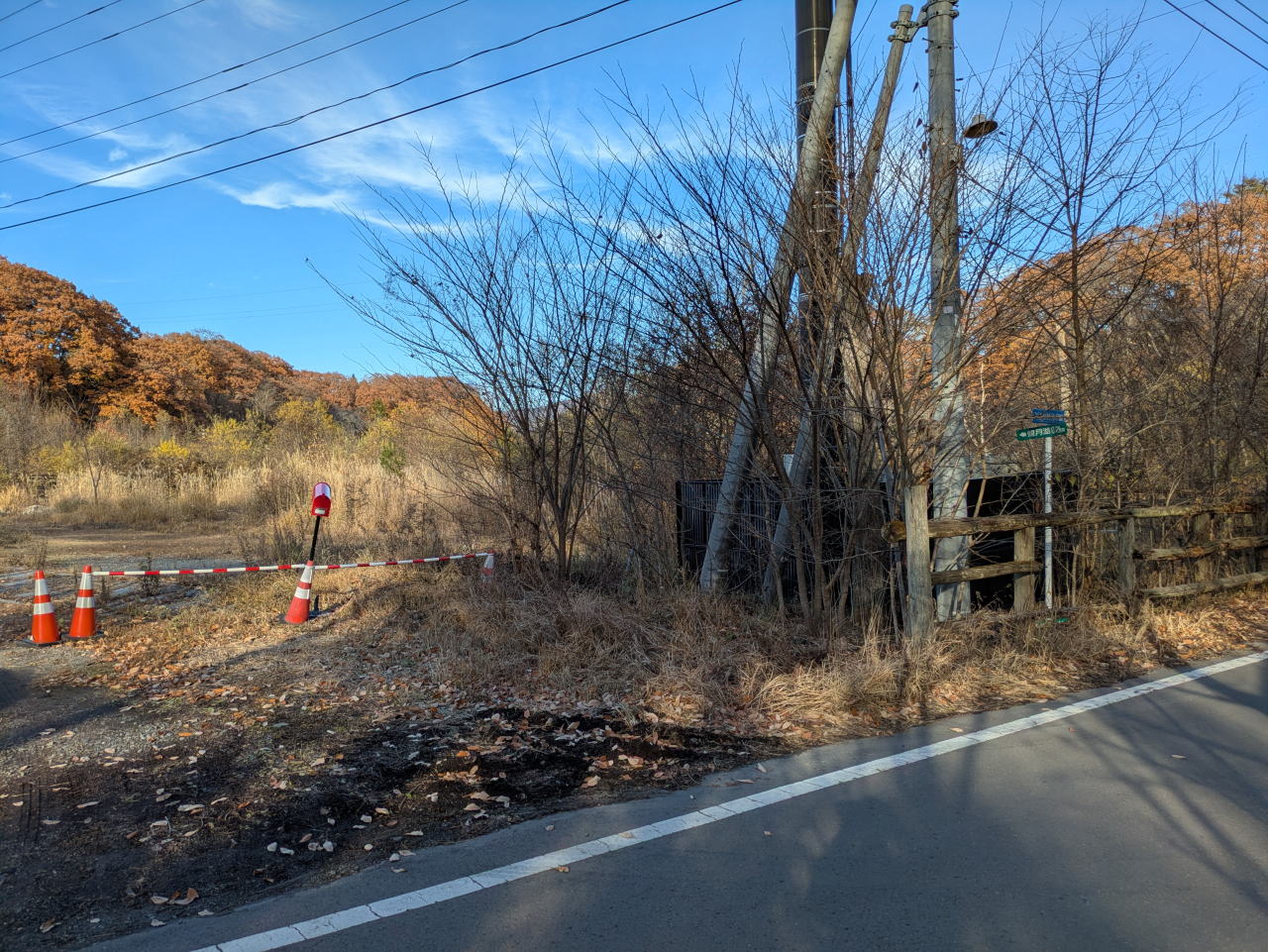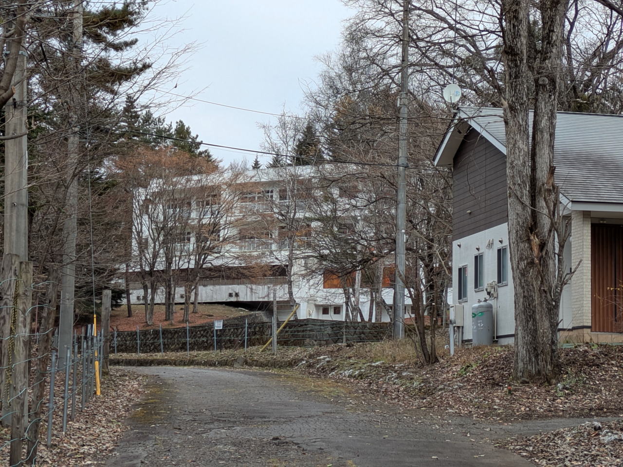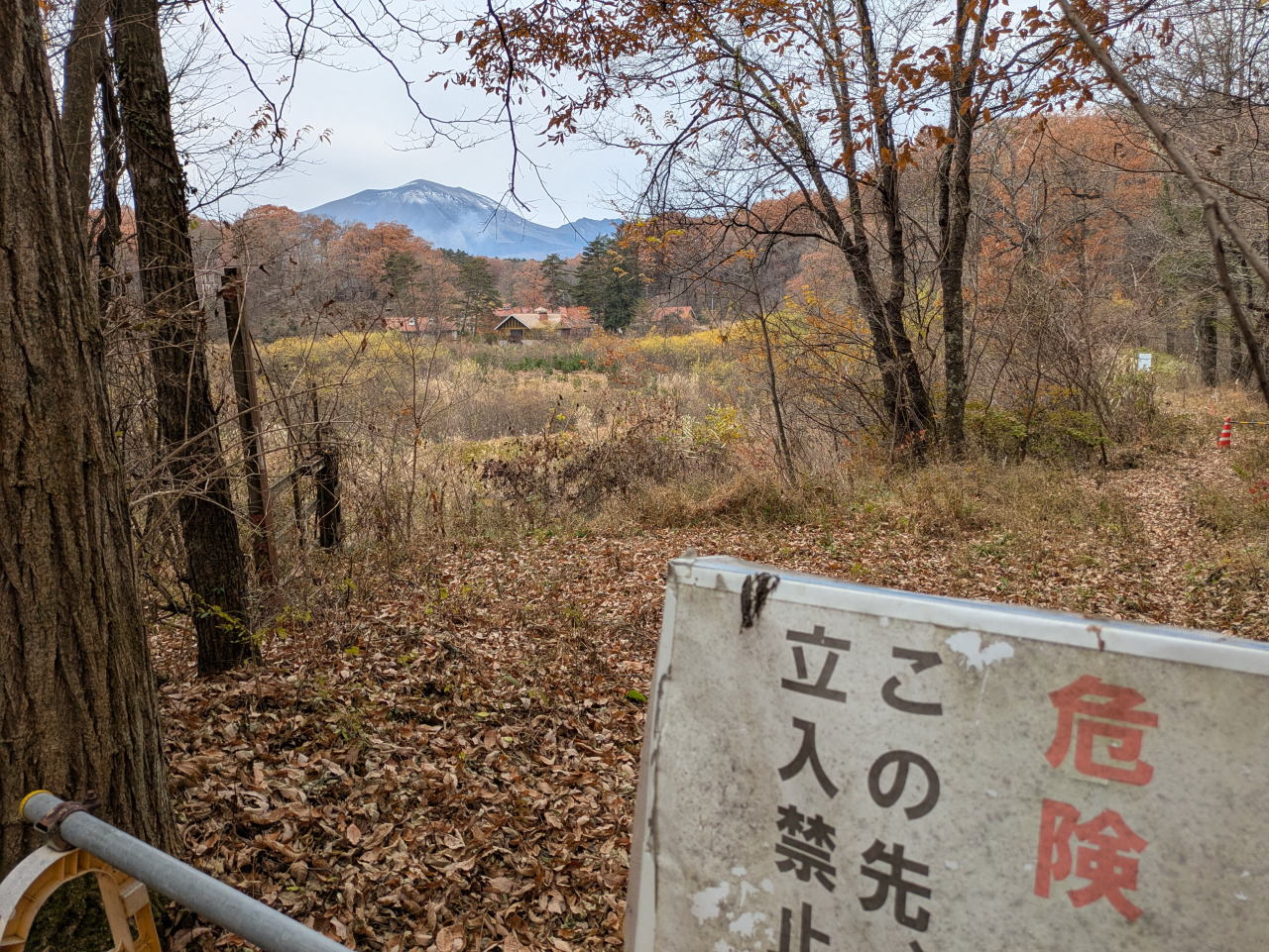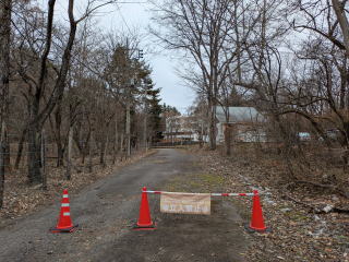 | 大学村よりさらに奥の別荘地あった。立入禁止となっていてこれ以上近寄ることはできない。この場所へ来る前の道路もアスファルトではあるものの全く整備されていない感じで、デコボコだし落ち葉も積もり放題。人の気配がある別荘もあったけどゴーストタウンの様相だった。 |